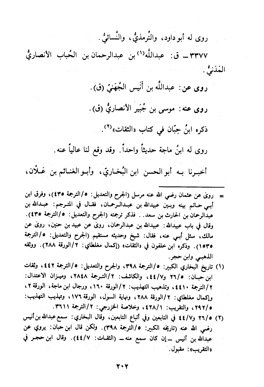 3377 - ق: عَبد اللَّهِ بن عَبْدِ الرَّحْمَنِ بن الْحُبَابِ الأَنْصارِيّ المدني (1) .