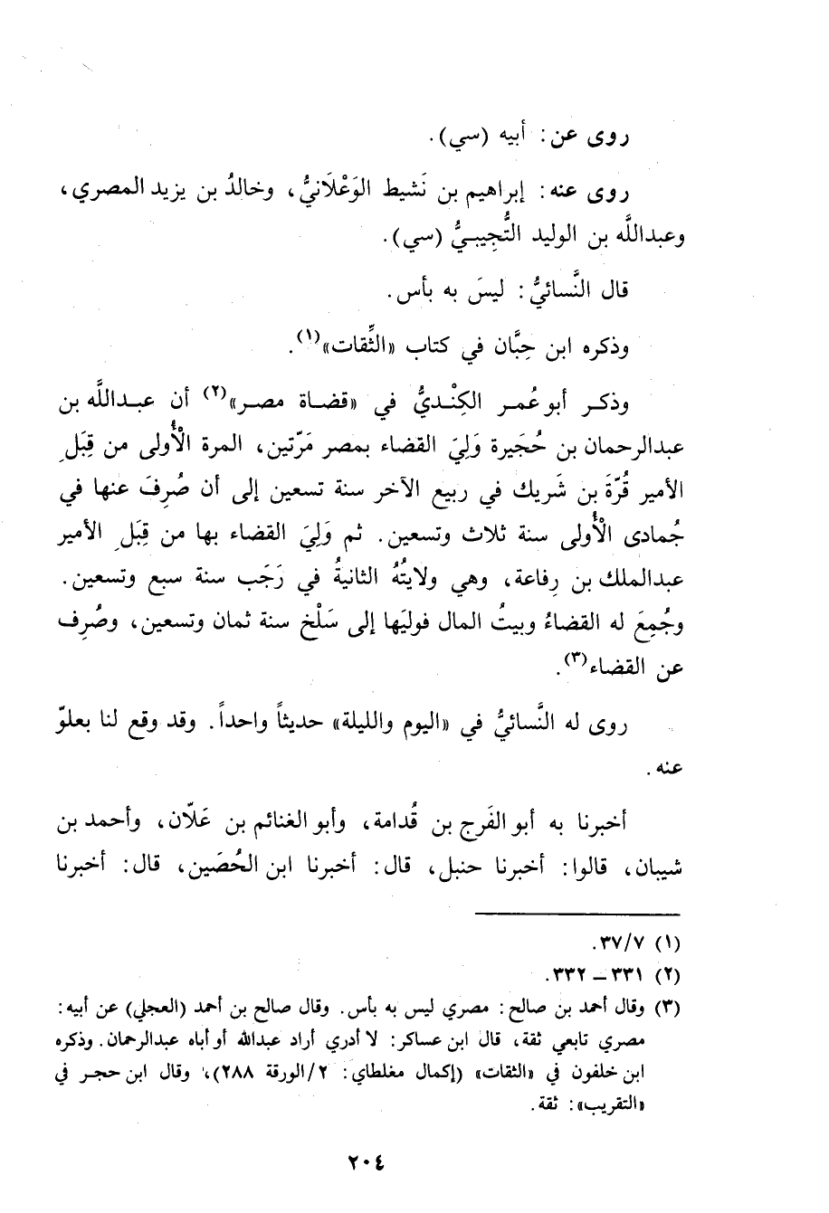 (3) وَقَال أَحْمَد بْن صَالِح: مصري ليس به بأس. وَقَال صالح بْن أحمد (العجلي) عَن أبيه: مصري تابعي ثقة، قال ابن عساكر: لا أدرى أراد عَبد الله أو أباه عبد الرحمن. وذكره ابن خلفون في "الثقات" (إكمال مغلطاي: 2 / الورقة 288) ، وَقَال ابن حجر في "التقريب": ثقة.