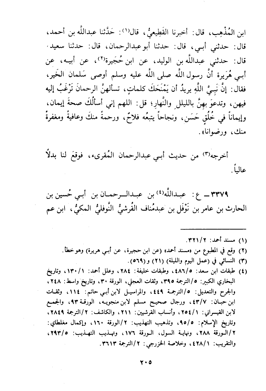 ابْنُ الْمُذْهِب، قال: أخبرنا القَطِيعِيّ، قال (1) : حَدَّثَنَا عَبد اللَّهِ بْن أَحْمَدَ، قال: حَدَّثني أبي، قال: حَدَّثَنَا أَبُو عَبْدِ الرَّحْمَنِ، قال: حَدَّثَنَا سَعِيد، قال: حَدَّثَنِي عَبد اللَّهِ بْنُ الْوَلِيدِ، عَنِ ابْنِ حُجَيْرَةَ (2) ، عَن أَبِيهِ، عَن أَبِي هُرَيْرة أَنَّ رَسُولَ اللَّهِ صَلَّى اللَّهُ عَلَيْهِ وسَلَّمَ أَوْصَى سَلْمَانَ الْخَيْرِ، فَقَالَ: إِنَّ نَبِيَّ اللَّهِ يُرِيدُ أَنْ يَمْنَحَكَ كَلِمَاتٍ، تَسْأَلُهُنَّ الرَّحْمَنَ تَرْغَبُ إِلَيْهِ فِيهِنَّ، وتَدْعُو بِهِنَّ بِاللَّيْلِ والنَّهَارِ ; قُلْ: اللَّهُمَّ إِنِّي أَسْأَلُكَ صِحَّةَ إِيمَانٍ، وإِيمَانًا فِي خُلُقٍ حَسَنٍ، ونَجَاحًا يَتْبَعُهُ فَلاحٌ، ورَحْمَةً مِنْكَ وعَافِيَةً ومَغْفِرَةً مِنْكَ، ورِضْوَانًا.
