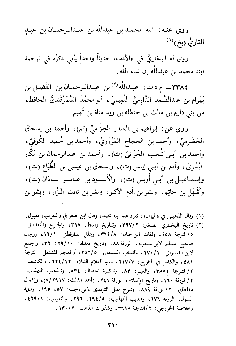 3384 - م د ت: عَبد اللَّهِ بن عَبْدِ الرَّحْمَنِ بن الْفَضْلِ بن بهرام بن عبد الصمد الدارمي التميمي (2) ، أَبُو محمد السمرقندي الحافظ، من بني دارم بن مالك بن حنظلة بن زيد مناة بن تميم.
