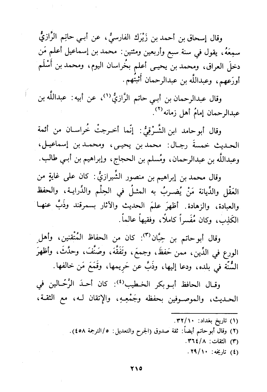وَقَال إسحاق بن أَحْمَدَ بن زيرك الفارسي، عَن أَبِي حاتم الرازي سمعه، يقول فِي سنة سبع وأربعين ومئتين: محمد بن إِسْمَاعِيلَ أعلم من دخل العراق، ومحمد بن يَحْيَى أعلم بخراسان اليوم، ومحمد بن أسلم أورعهم، وعَبْد اللَّهِ بن عَبْدِ الرَّحْمَنِ أثبتهم.