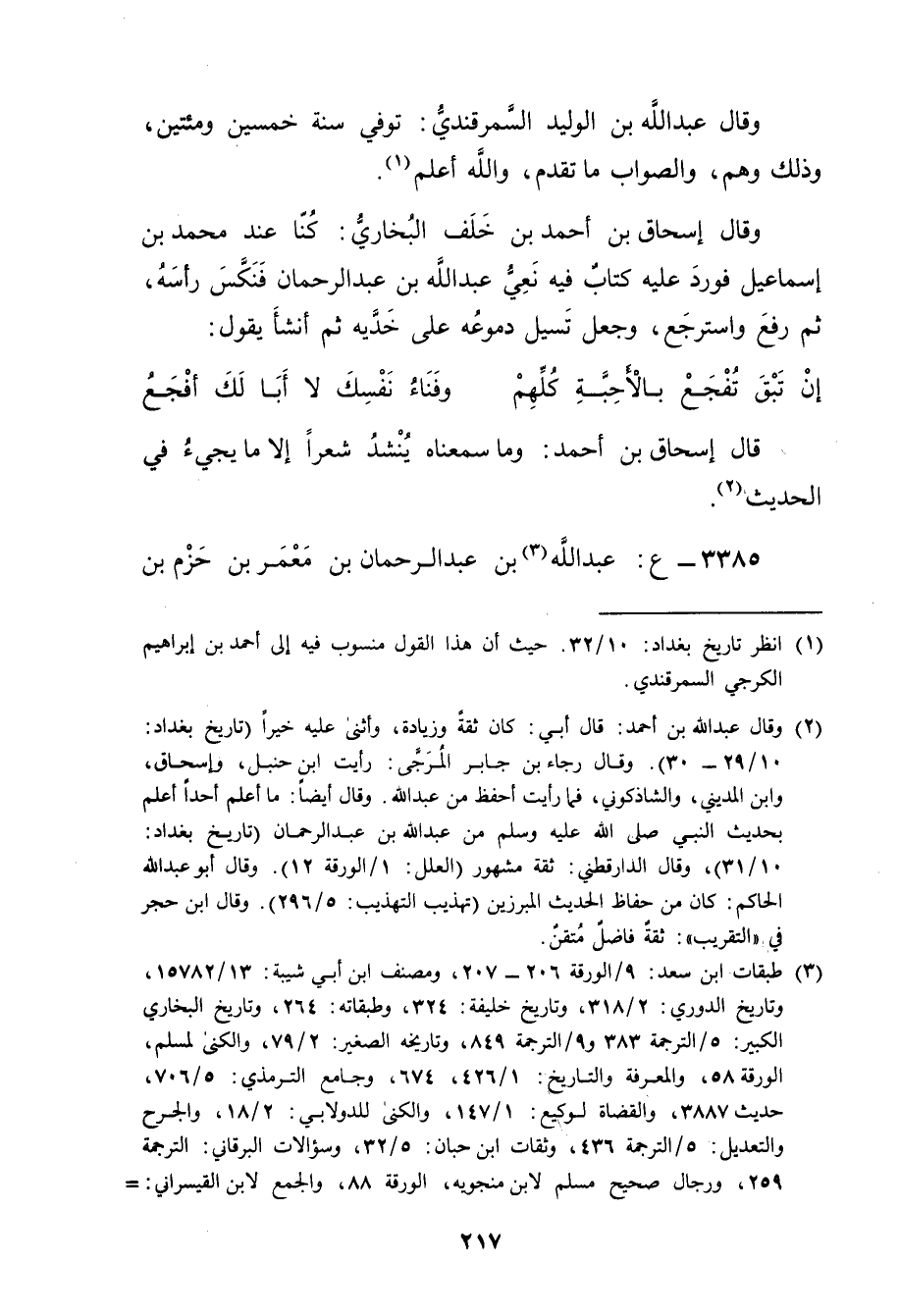 وَقَال إسحاق بن أَحْمَدَ بن خلف البخاري: كنا عند محمد بن إِسْمَاعِيلَ فورد عَلَيْهِ كتاب فِيهِ نعي عَبد اللَّهِ بن عَبْدِ الرَّحْمَنِ فنكس رأسه، ثم رفع واسترجع، وجعل تسيل دموعه على خديه ثم أنشأ يقول: