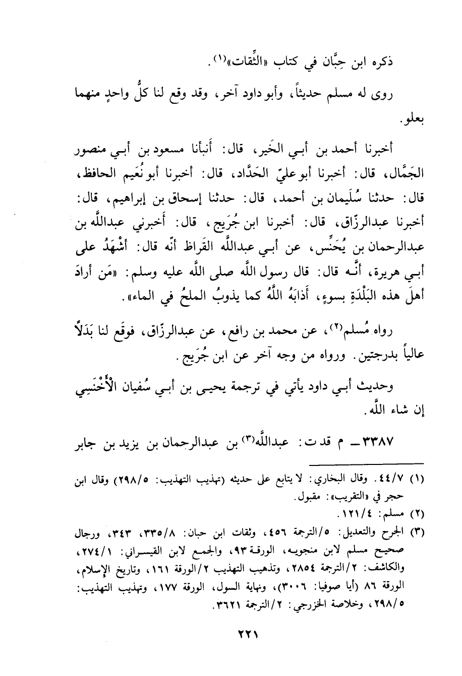 (3) الجرح والتعديل: 5 / الترجمة 456، وثقات ابن حبان: 8 / 335، 343، ورجال صحيح مسلم لابن منجويه، الورقة 93، والجمع لابن القيسراني: 1 / 274، والكاشف: 2 / الترجمة 2854، وتذهيب التهذيب 2 / الورقة 161، وتاريخ الاسلام، الورقة 86 (أيا صوفيا: 3006) ، ونهاية السول، الورقة 177، وتهذيب التهذيب: 5 / 298، وخلاصة الخزرجي: 2 / الترجمة 3621.