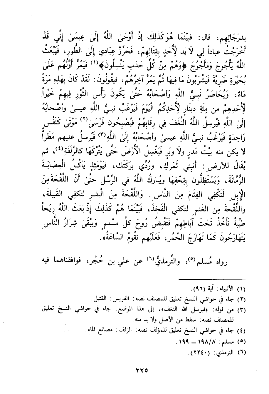 بِدَرَجَاتِهِمْ، قال: فَبَيْنَمَا هُوَ كَذَلِكَ إِذْ أَوْحَى اللَّهُ إِلَى عِيسَى إِنِّي قَدْ أَخْرَجْتُ عِبَادًا لِي لايد لأَحَدٍ بِقِتَالِهِمْ، فَحَرِّزْ عِبَادِي إِلَى الطُّورِ، فَيَبْعَثُ اللَّهُ يَأْجُوجَ ومَأْجُوجَ {وهم مِنْ كُلِّ حَدَبٍ يَنْسِلُونَ) {1) فَيَمُرُّ أَوَّلُهُمْ عَلَى بُحَيْرَةِ طَبَرِيَّةَ فَيَشْرَبُونَ مَا فِيهَا ثُمَّ يَمُرُّ آخِرُهُمْ، فَيَقُولُونَ: لَقَدْ كَانَ بِهَذِهِ مَرَّةً مَاءٌ، ويُحَاصِرُ نَبِيَّ اللَّهِ وأَصْحَابَهُ حَتَّى يَكُونَ رَأْسُ الثَّوْرِ فيهم خيرا لاحدهم من مئة دِينَارٍ لأَحَدِكُمُ الْيَوْمَ فَيَرْغَبُ نَبِيُّ اللَّهِ عِيسَى وأَصْحَابُهُ إِلَى اللَّهِ فَيُرْسِلُ اللَّهُ النَّغَفَ فِي رِقَابِهِمْ فَيُصْبِحُونَ فَرْسَى (2) مَوْتَى كَنَفْسٍ واحِدَةٍ فَيَرْغَبُ نَبِيُّ اللَّهِ عِيسَى وأَصْحَابُهُ إِلَى اللَّهِ (3) فَيُرْسِلُ عَلَيْهِمْ مَطَرًا لا يَكُنْ مِنْهُ بَيْتُ مَدَرٍ ولا وبَرٍ فَيَغْسِلُ الأَرْضَ حَتَّى يَتْرُكَهَا كَالزَّلَفَةِ (4) ، ثُمَّ يُقَالُ لِلأَرْضِ: أَنْبِتِي ثَمَرَكِ، ورُدِّي بَرَكَتَكِ، فَيَوْمَئِذٍ يَأْكُلُ الْعِصَابَةُ الرُّمَّانَةَ، ويَسْتَظِلُّونَ بِقِحْفِهَا ويُبَارَكُ اللَّهُ فِي الرِّسْلِ حَتَّى أَنَّ اللِّقْحَةَ مِنَ الإِبِلِ لَتَكْفِي الْفِئَامَ مِنَ النَّاسِ. واللِّقْحَةُ مِنَ الْبَقَرِ لَتَكْفِي الْقَبِيلَةَ، واللِّقْحَةُ مِنَ الْغَنَمِ لَتَكْفِي الْفَخِذَ، فَبَيْنَمَا هُمْ كَذَلِكَ إِذْ بَعَثَ اللَّهُ رِيحًا طَيِّبَةً تَأْخُذُ تَحْتَ آبَاطِهِمْ فَتَقْبِضُ رُوحَ كُلِّ مُسْلِمٍ ويَبْقَى شِرَارُ النَّاسِ يَتَهَارَجُونَ كَمَا تَهَارَجُ الْحُمُرُ، فعليهم تقوم الساعة.