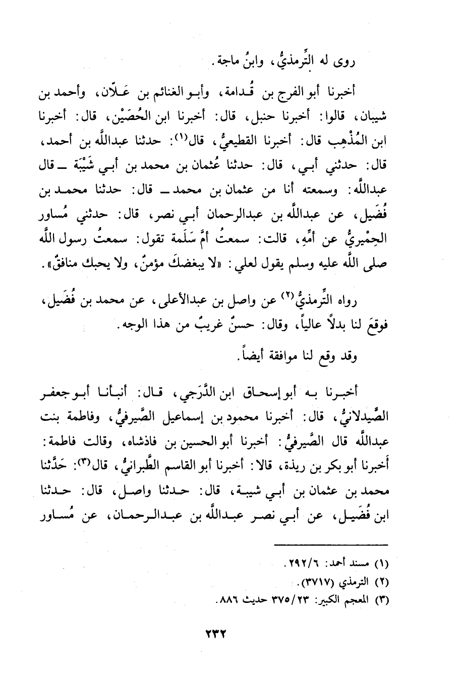 أخبرنا أَبُو الْفَرَجِ بْنُ قُدَامَةَ، وأبو الغنائم بْن علان، وأحمد بْنُ شَيْبَانَ، قَالُوا: أَخْبَرَنَا حَنْبَلُ، قال: أخبرنا ابن الحصين، قال: أخبرنا ابْنُ الْمُذْهِب قال: أخبرنا القَطِيعِيّ، قال (1) : حَدَّثَنَا عَبد الله بْن أَحْمَدَ، قال: حَدَّثني أبي، قال: حَدَّثَنَا عُثْمَانُ بْنُ مُحَمَّدِ بْنِ أَبي شَيْبَة، قال عَبد اللَّهِ: وسَمِعْتُهُ أَنَا مِنْ عُثْمَانَ بْن مُحَمَّد، قال: حَدَّثَنَا مُحَمَّدُ بْنُ فُضَيْلٍ، عَنْ عَبد اللَّهِ بْنِ عَبْدِ الرَّحْمَنِ أَبِي نَصْرٍ، قال: حَدَّثَنِي مُسَاوِرٌ الْحِمْيَرِيُّ عَنْ أُمِّه، قَالَتْ: سَمِعْتُ أُمَّ سَلَمَةَ تَقُولُ: سَمِعْتُ رَسُولَ اللَّهِ صَلَّى اللَّهُ عَلَيْهِ وسَلَّمَ يَقُولُ لِعَلِيٍّ: لا يُبْغِضُكَ مُؤْمِنٌ، ولا يُحِبُّكَ مُنَافِقٌ.