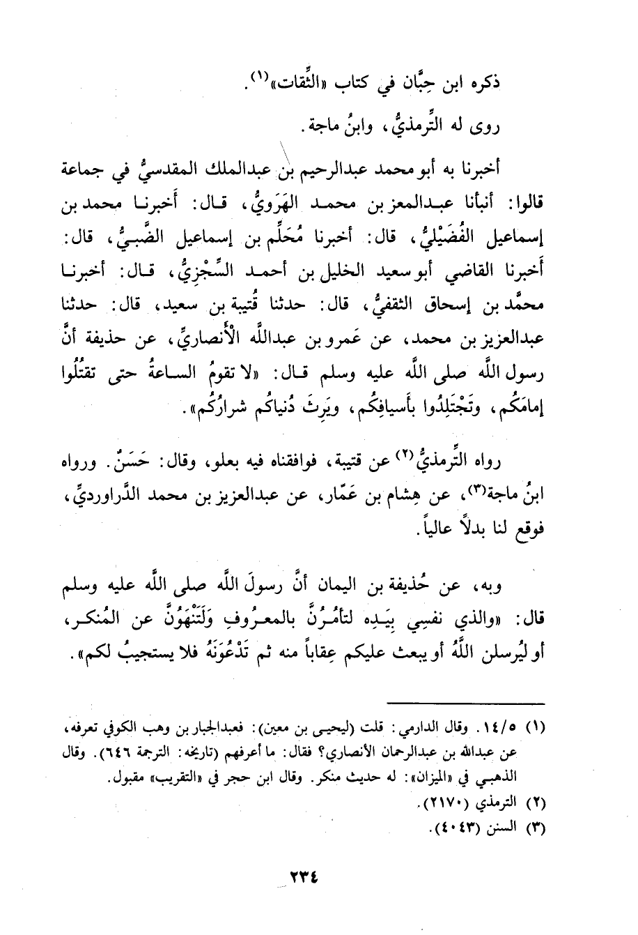 وبِهِ، عَنْ حُذَيْفَةَ بْنِ الْيَمَانِ أَنَّ رَسُول اللَّهِ صلى الله عليه وسَلَّمَ قال: والَّذِي نَفْسِي بِيَدِهِ لَتَأْمُرُنَّ بِالْمَعْرُوفِ ولَتَنْهَوُنَّ عَنِ الْمُنْكَرِ، أَوْ لَيُرْسِلَنَّ اللَّهُ أَوْ يَبْعَثُ عَلَيْكُمْ عِقَابًا مِنْهُ ثُمَّ تَدْعُونَهُ فلا يستجيب لكم.
