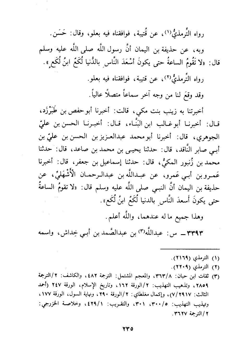 أَخْبَرَتْنَا بِهِ زَيْنَبُ بِنْتُ مَكِّيٍّ، قَالَتْ: أخبرنا أبو حفص بن طَبَرْزَذَ، قال: أخبرنا أَبُو غالب ابْن البناء، قال: أخبرنا الحسن بْن علي الجوهري، قال: أَخْبَرَنَا أبو مُحَمَّدٍ عَبْدُ الْعَزِيزِ بْنُ الْحَسَنِ بْنِ عَلِيِّ بْنِ أَبي صَابِرٍ النَّاقِدُ، قال: حَدَّثَنَا يَحْيَى بْنُ مُحَمَّد بْن صاعد، قال: حَدَّثَنَا مُحَمَّدُ بْنُ زُنْبُورٍ الْمَكِّيُّ، قال: حَدَّثَنَا إِسْمَاعِيلُ بْنُ جَعْفَرٍ، قال: أَخْبَرَنَا عَمْرو بْنُ أَبي عَمْرو، عن عَبد اللَّهِ بْن عَبْد الرَّحْمَنِ الأَشْهَلِيِّ، عَنْ حُذَيْفَةَ بْنِ الْيَمَانِ أَنَّ النَّبِيَّ صَلَّى اللَّهُ عَلَيْهِ وسَلَّمَ قال: لا تَقُومُ السَّاعَةُ حَتَّى يَكُونَ أَسْعَدَ النَّاسِ بِالدُّنْيَا لَكُعٌ ابْنُ لُكَعٍ.