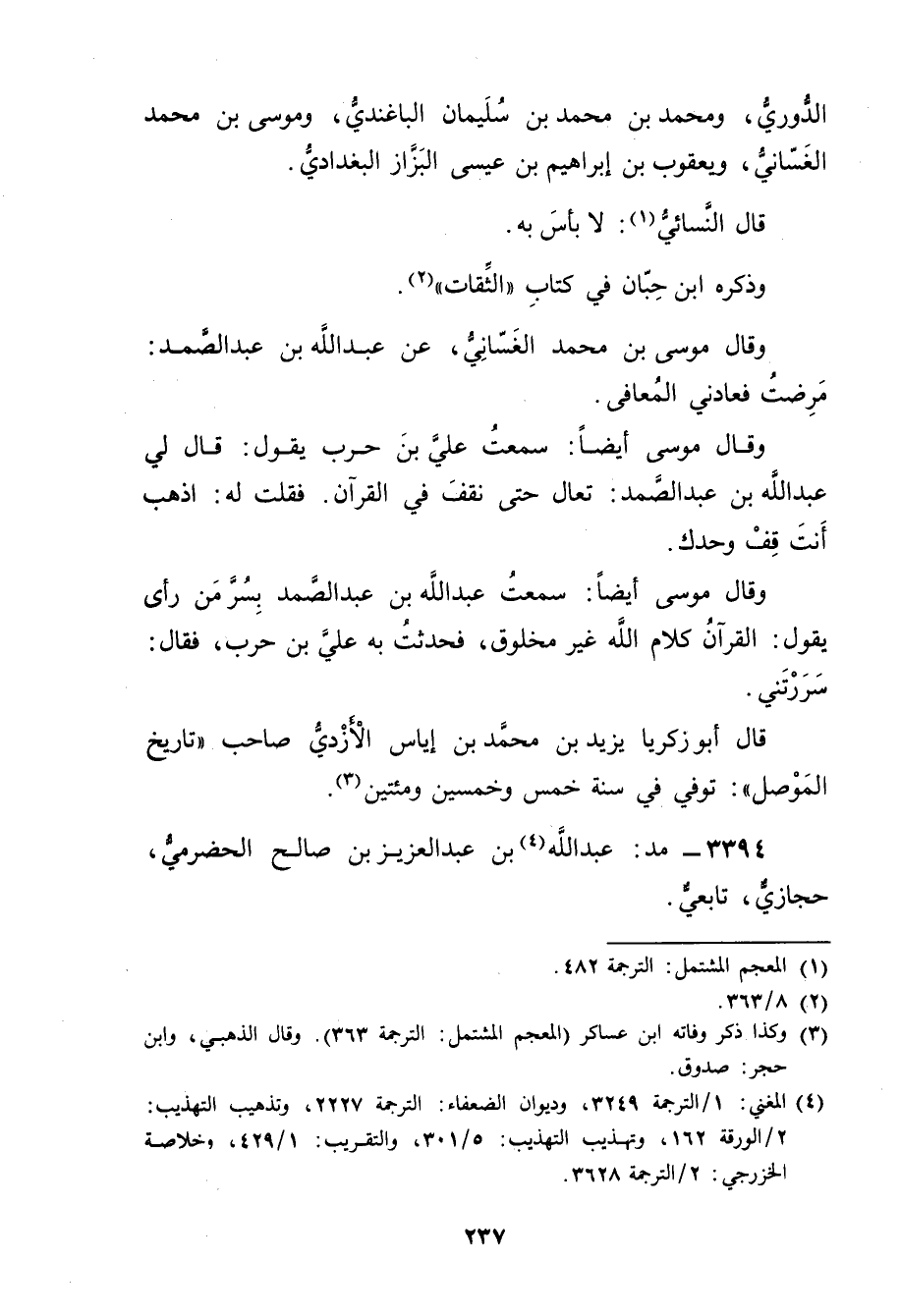 وَقَال مُوسَى أَيْضًا: سمعت علي بن حرب يقول: قال لي عَبد الله بن عبد الصمد: تعالى حتى نقف فِي القرآن. فقلت لَهُ: اذهب أنت قف وحدك.