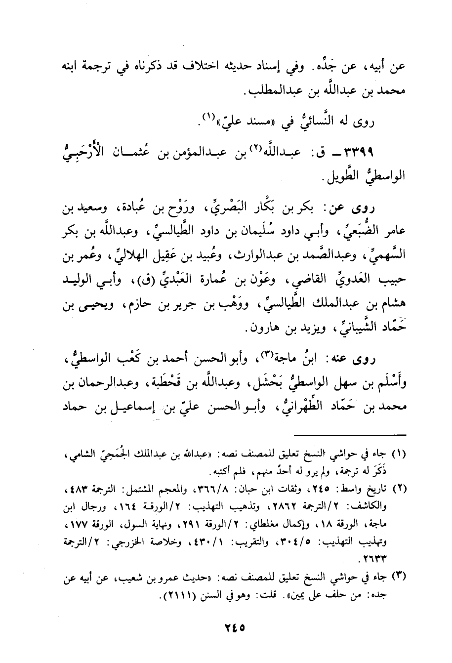 (2) تاريخ واسط: 245، وثقات ابن حبان: 8 / 366، والمعجم المشتمل: الترجمة 483، والكاشف: 2 / الترجمة 2862، وتذهيب التهذيب: 2 / الورقة 164، ورجال ابن ماجة، الورقة 18، وإكمال مغلطاي: 2 / الورقة 291، ونهاية السول، الورقة 177، وتهذيب التهذيب: 5 / 304، والتقريب: 1 / 430، وخلاصة الخزرجي: 2 / الترجمة 2633.