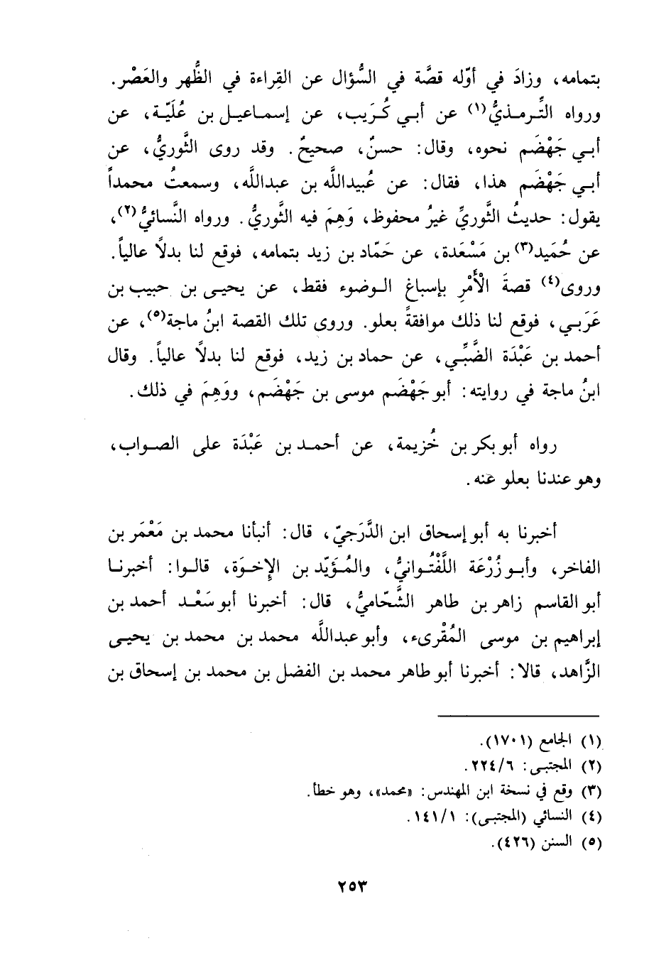ورَوَاهُ التِّرْمِذِيّ (1) عَن أبي كريب، عن إسماعيل بن عليه، عَن أَبِي جَهْضَمٍ نَحْوَهُ، وَقَال: حَسَنٌ، صَحِيحٌ. وقَدْ رَوَى الثَّوْرِيُّ، عَن أَبِي جَهْضَمٍ هَذَا، فَقَالَ: عَنْ عُبَيد اللَّهِ بْنِ عَبد اللَّهِ، وسَمِعْتُ مُحَمَّدًا يَقُولُ: حَدِيثُ الثَّوْرِيِّ غَيْرُ مَحْفُوظٍ، وهِمَ فِيهِ الثَّوْرِيُّ. ورَوَاهُ النَّسَائي (2) ، عَنْ حُمَيْدِ (3) بْنِ مَسْعَدَةَ، عَنْ حَمَّادِ بْنِ زَيْدٍ بِتَمَامِهِ، فَوَقَعَ لَنَا بَدَلا عَالِيًا. ورَوَى (4) قِصَّةَ الأَمْرِ بِإِسْبَاغِ الْوُضُوءِ فط، عَنْ يَحْيَى بْنِ حَبِيبِ بْنِ عَرَبِيٍّ، فَوَقَعَ لَنَا ذَلِكَ مُوَافَقَةً بِعُلُوٍّ. ورَوَى تِلْكَ الْقِصَّةَ ابْنُ ماجه (5) ، عَنْ أَحْمَد بْن عبدة الضبي، عَنْ حماد بْن زيد، فوقع لنا بدلا عاليا. وَقَال ابن ماجة في روايته: أبوجهضم مُوسَى بْنُ جَهْضَمٍ، ووَهِمَ فِي ذَلِكَ.