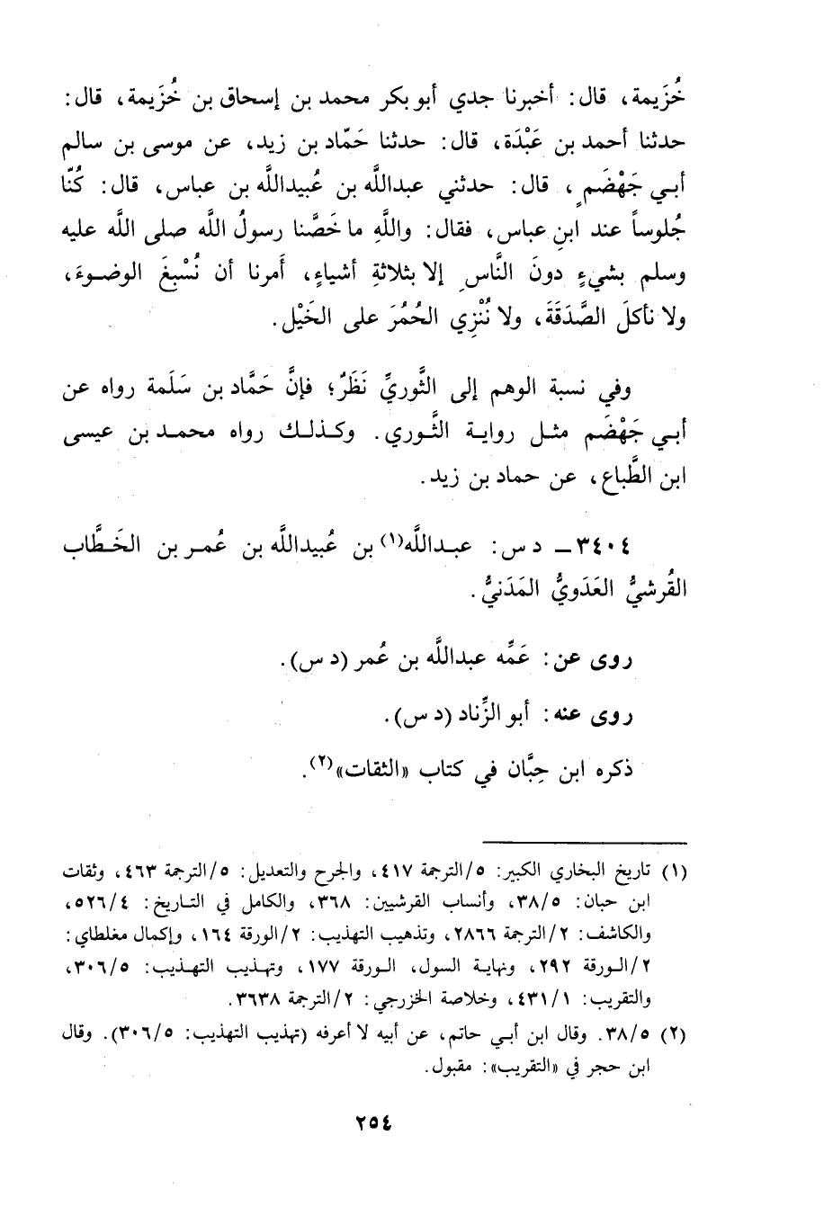 خُزَيْمَةَ، قال: أَخْبَرَنَا جَدِّي أَبُو بَكْر مُحَمَّد بْن إسحاق بْن خُزَيْمَةَ، قال: حَدَّثَنَا أَحْمَدُ بْنُ عَبْدَةَ، قال: حَدَّثَنَا حَمَّادُ بْنُ زَيْدٍ، عَنْ مُوسَى بْنِ سَالِمٍ أَبِي جَهْضَمٍ، قال: حَدَّثَنِي عَبد الله بن عُبَيد الله بن عَبَّاسٍ، قال: كُنَّا جُلُوسًا عِنْدَ ابْنِ عَبَّاسٍ، فَقَالَ: واللَّهِ مَا خَصَّنَا رَسُولُ اللَّهِ صَلَّى اللَّهُ عَلَيْهِ وسَلَّمَ بشيءٍ دُونَ النَّاسِ إِلا بِثَلاثَةِ أَشْيَاءَ، أَمَرَنَا أَنْ نُسْبِغَ الْوُضُوءَ، ولا نَأْكُلُ الصَّدَقَةَ، زولا نُنْزِي الْحُمُرَ عَلَى الْخَيْلِ.