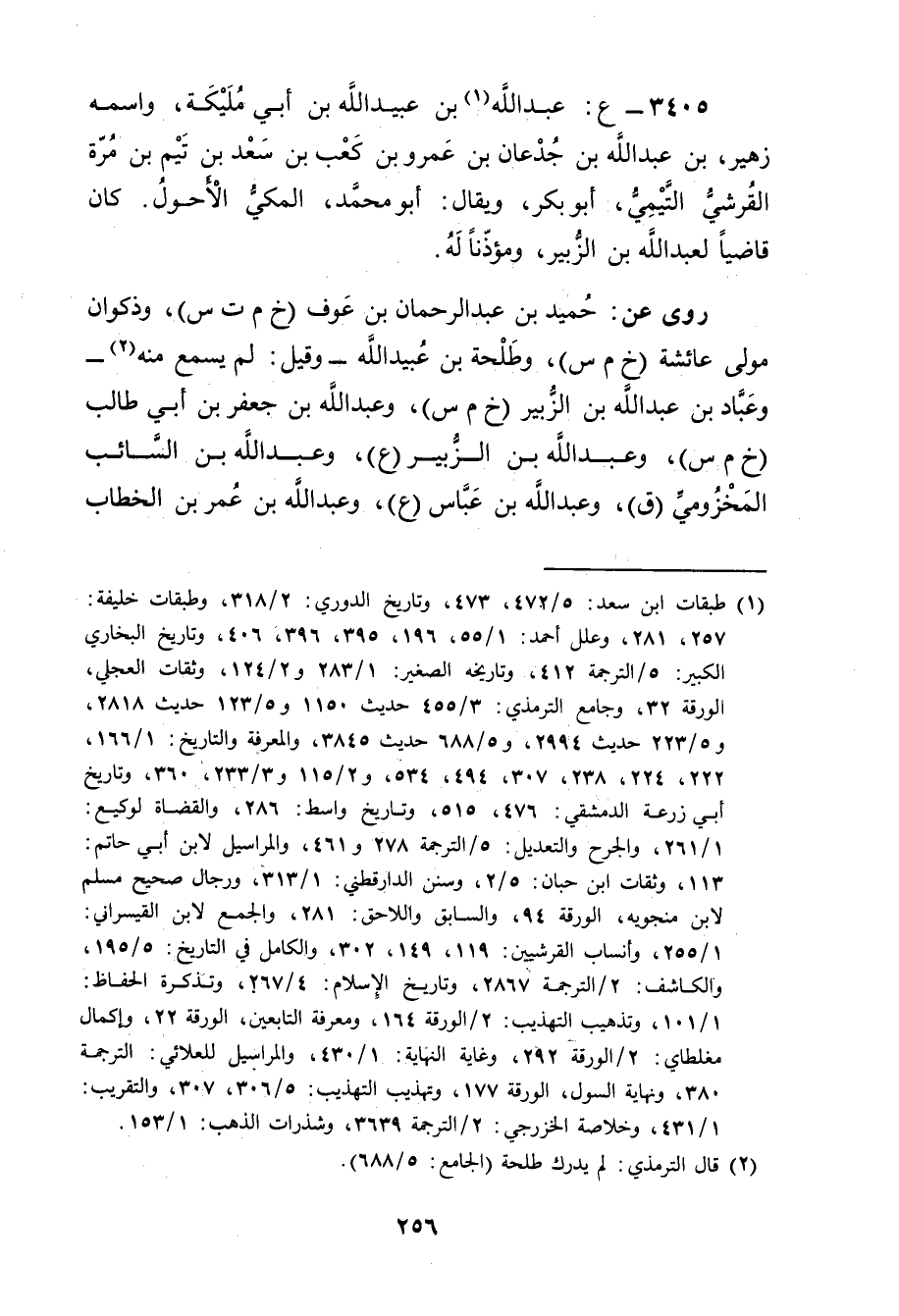 3405 - ع: عَبد الله بن عُبَيد الله بن أَبي مليكة (1) ، واسمه زهير، بن عَبد الله بن جدعان بْن عَمْرو بْن كعب بْن سعد بْن تيم بْن مره القرشي التَّيْمِيّ، أَبُو بكر، ويُقال: أَبُو محمد، المكي الأحول. كان قاضيا لعَبد اللَّهِ بن الزبير، ومؤذنا لَهُ.