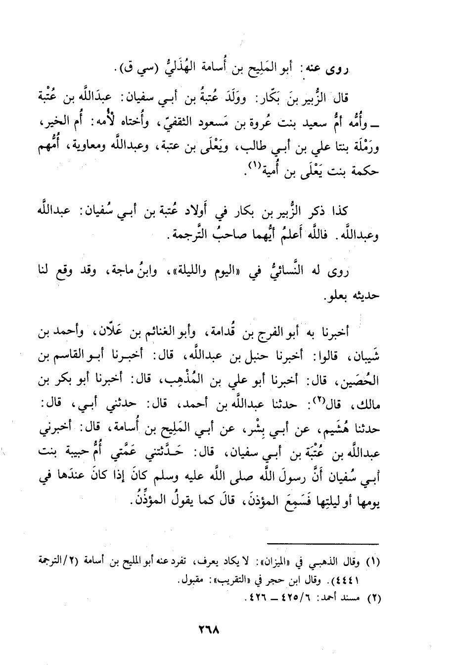 أَخْبَرَنَا بِهِ أَبُو الْفَرَجِ بْنُ قُدَامَةَ، وأَبُو الْغَنَائِمِ بْنُ عَلانَ، وأَحْمَدُ بْنُ شَيْبَانَ، قَالُوا: أَخْبَرَنَا حنبل بْن عَبد الله، قال: أَخْبَرَنَا أبو القاسم بْن الحصين، قال: أَخْبَرَنَا أَبُو علي بْن المذهب، قال: أَخْبَرَنَا أبو بكر بْن مالك، قال (2) : حَدَّثَنَا عَبد اللَّهِ بْن أَحْمَدَ، قال: حَدَّثني أَبِي، قال: حَدَّثَنَا هُشَيْمٌ، عَن أَبِي بِشْرٍ، عَن أَبِي الْمَلِيحِ بْنِ أُسَامَةَ، قال: أَخْبَرَنِي عَبد اللَّهِ بن عتبة بن أَبي سُفْيَانَ، قال: حَدَّثَتْنِي عَمَّتِي أُمُّ حَبِيبَةَ بِنْتُ أَبِي سُفْيَانَ أَنَّ رَسُول اللَّهِ صلى الله عليه وسَلَّمَ كَانَ إِذَا كَانَ عِنْدَهَا فِي يَوْمِهَا أَوْ لَيْلَتِهَا فَسَمِعَ الْمُؤَذِّنَ، قال كَمَا يَقُولُ الْمُؤَذِّنُ.