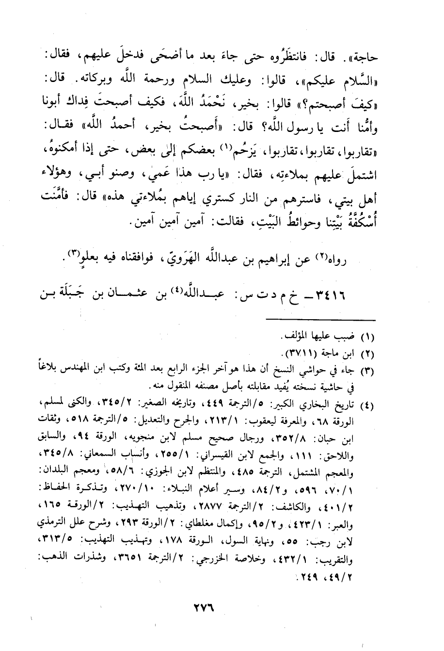 حَاجَةً". قال: فَانْتَظَرُوهُ حَتَّى جَاءَ بَعَدَ مَا أَضْحَى فَدَخَلَ عَلَيْهِمْ، فَقَالَ: السَّلامُ عَلَيْكُمْ"، قَالُوا: وعَلَيْكَ السَّلامُ ورَحْمَةُ اللَّهِ وبَرَكَاتُهُ.