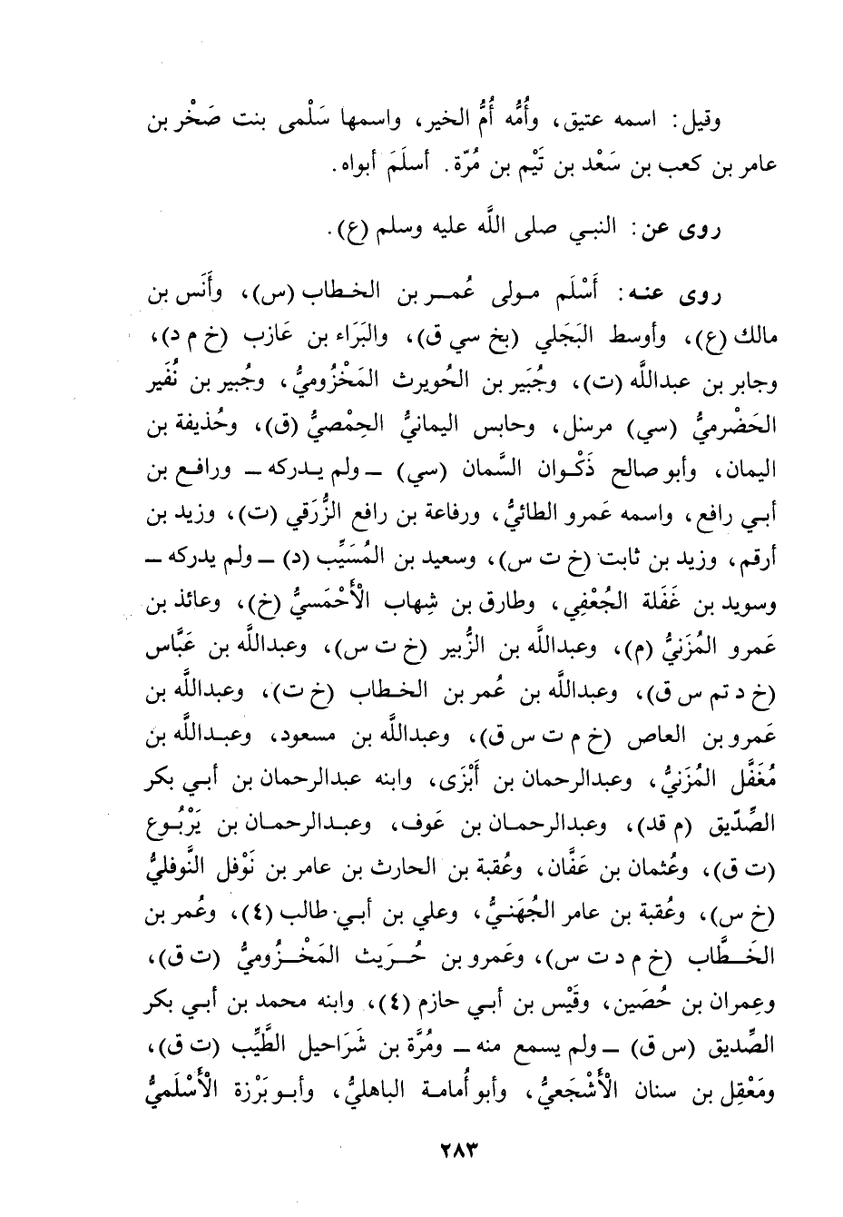 رَوَى عَنه: أسلم مولى عُمَر بن الخطاب (س) ، وأنس بن مالك (ع) ، وأوسط البجلي (بخ سي ق) ، والبراء بن عازب (خ م د) ، وجابر بن عَبد اللَّهِ (ت) ، وجبير بن الحويرث المخزومي، وجبير بن نفير الحضرمي (سي) مرسل، وحابس اليماني الحمصي (ق) ، وحذيفة بن اليمان، وأَبُو صالح ذكوان السمان (سي) - ولم يدركه - ورافع بن أَبي رافع، واسمه عَمْرو الطائي، ورفاعة بن رافع الزرقي (ت) ، وزيد بْن أرقم، وزيد بْن ثابت (خ ت س) ، وسَعِيد بْن المُسَيَّب (د) - ولم يدركه - وسويد بن غفلة الجعفي، وطارق بن شهاب الأحمسي (خ) ، وعائذ بن عَمْرو المزني (م) ، وعبد اللَّه بن الزبير (خ ت س) ، وعبد الله بْن عباس (خ د تم س ق) ، وعبد اللَّهِ بْن عُمَر بْن الخطاب (خ ت) ، وعبد اللَّه بْن عَمْرو بْن العاص (خ م ت س ق) ، وعبد الله بن مَسْعُودٍ، وعَبْد اللَّهِ بن مغفل المزني، وعبد الرحمن بْن أبزى، وابنه عَبْد الرَّحْمَنِ بن أَبي بكر الصديق (م قد) ، وعبد الرحمن بن عوف، وعبد الرحمن بن يربوع (ت ق) ، وعثمان بن عفان، وعقبة بن الْحَارِثِ بن عامر بن نوفل النوفري (خ س) ، وعقبة بن عامر الْجُهَنِيّ، وعلي بْن أَبي طَالِب (4) ، وعُمَر بْن الخطاب (خ م د ت س) ، وعَمْرو بْن حريث المخزومي (ت ق) ، وعِمْران بن حصين، وقيس بن أَبي حازم (4) ، وابنه محمد بن أَبي بكر الصديق (س ق) - ولم يسم منه - ومرة بن شراحيل الطيب (ت ق) ، ومعقل بن سنان الأشجعي، وأَبُو إمامة الباهلي، وأَبُو برزة الأَسلميّ