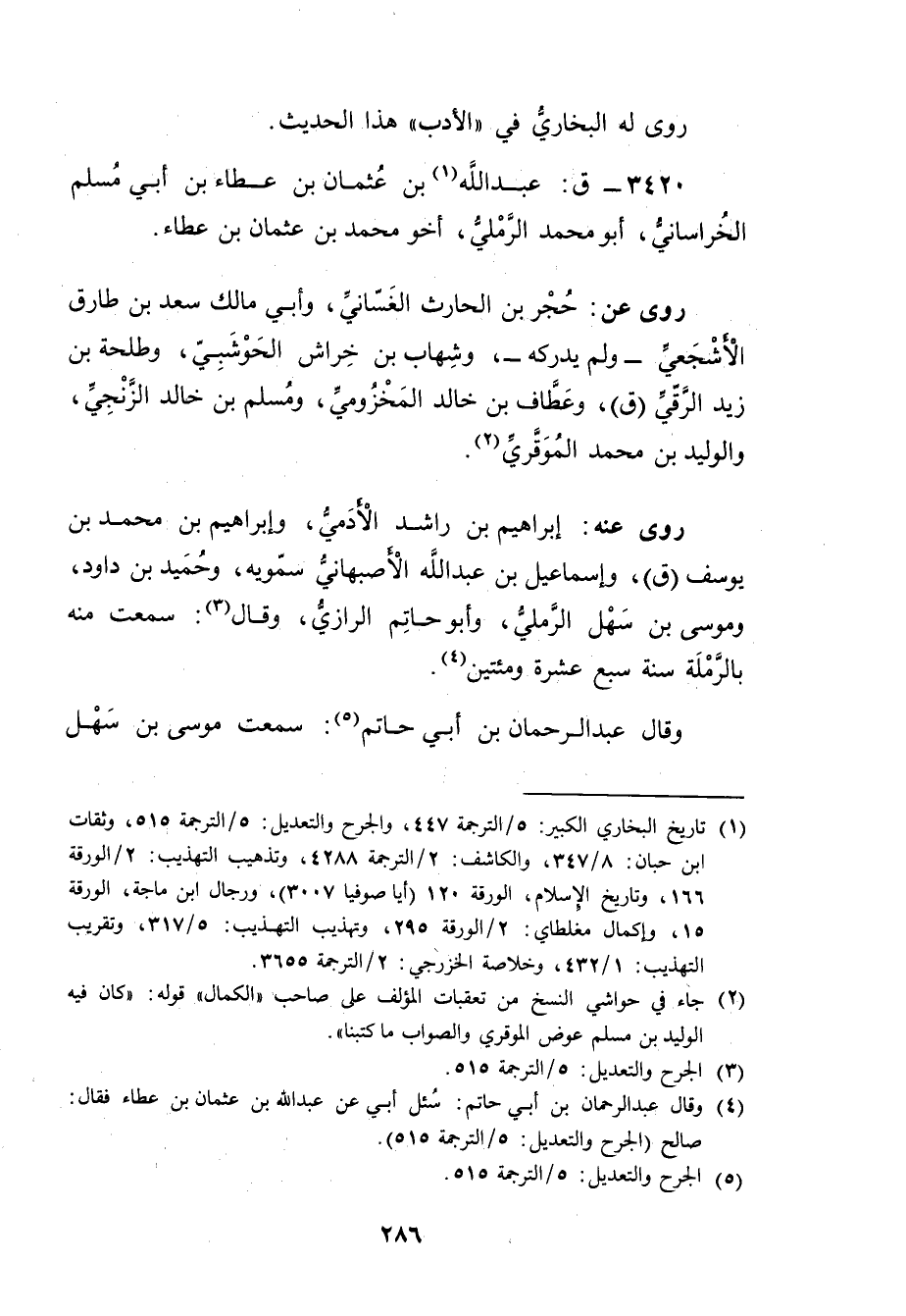 3420 - ق: عَبد اللَّهِ بْن عُثْمَانَ بْن عطاء بْن أَبي مسلم الخراساني (1) ، أَبُو محمد الرملي، أخو محمد بن عثمان بن عطاء.