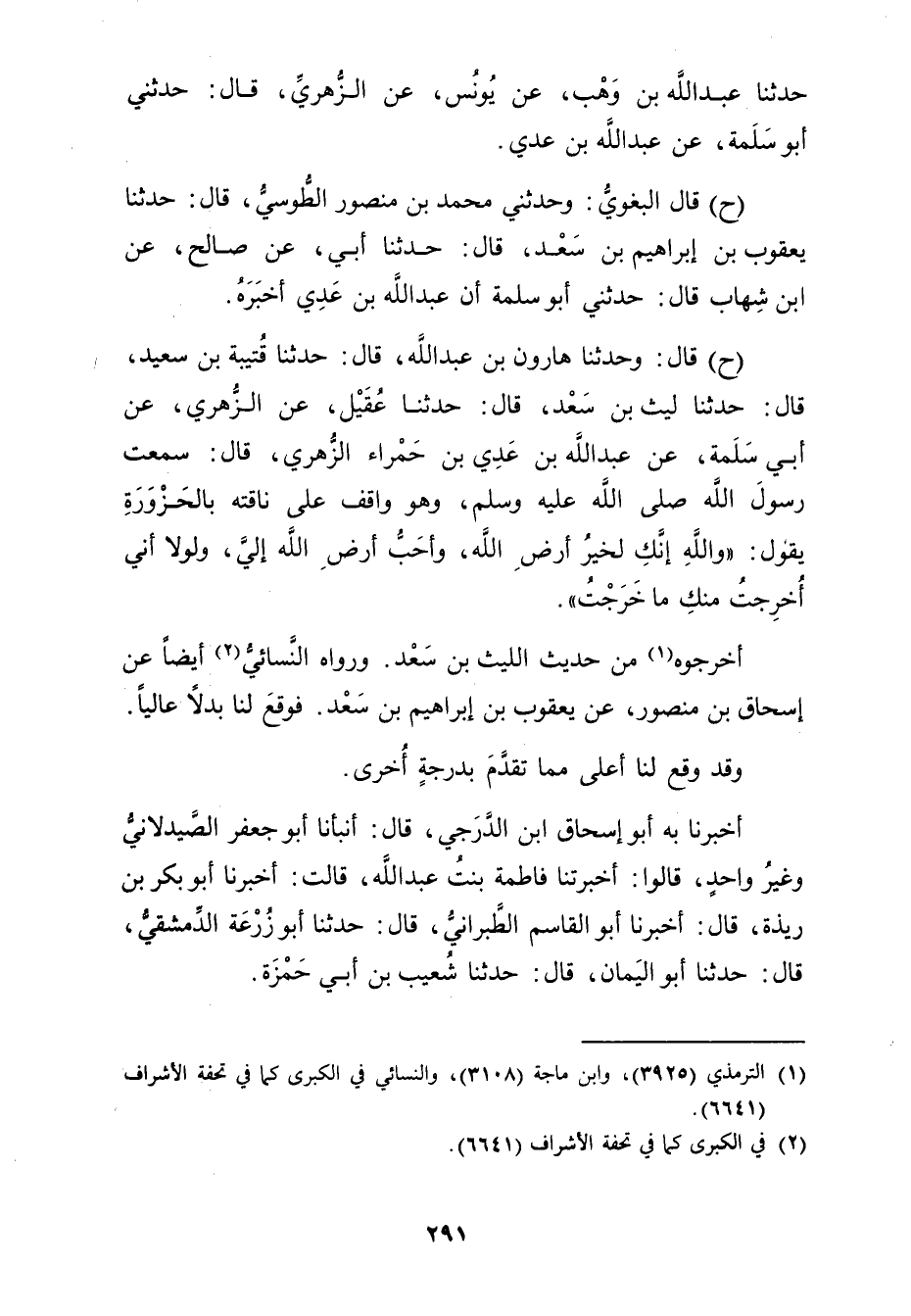 (ح) قال: وحَدَّثَنَا هَارُونُ بْنُ عَبد اللَّهِ، قال: حَدَّثَنَا قُتَيْبَةُ بْنُ سَعِيد، قال: حَدَّثَنَا لَيْثُ بْنُ سَعْدٍ، قال: حَدَّثَنَا عُقَيْلٌ، عَنِ الزُّهْرِيّ، عَن أَبِي سَلَمَة، عَنْ عَبد اللَّهِ بْن عَدِيِّ بْنِ حَمْرَاءَ الزُّهْرِيّ، قال: سمعت رَسُول اللَّهِ صَلَّى اللَّهُ عَلَيْهِ وسَلَّمَ، وهُوَ واقِفٌ عَلَى نَاقَتِهِ بِالْحَزْوَرَةِ يَقُولُ: واللَّهِ إِنَّكِ لَخَيْرُ أَرْضِ اللَّهِ، وأَحَبُّ أَرْضِ اللَّهِ إِلَيَّ، ولَوْلا أَنِّي أُخْرِجْتُ مِنْكِ مَا خَرَجْتُ.