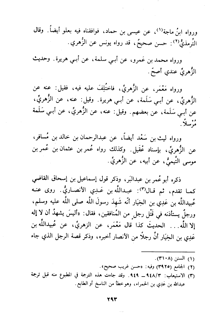 (3) الاستيعاب: 3 / 948 - 949. وقد جاءت هذه الترجمة في المطبوع منه قبل ترجمة عَبد اللَّهِ بن عدي بن الحمراء، وهو خطأ من الناسخ أو الطابع.