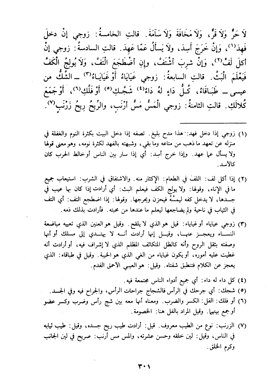 لا حَرٌّ ولا قَرٌّ، ولا مَخَافَةَ ولا سَامَةَ. قَالَتِ الْخَامِسَةُ: زَوْجِي إِنْ دَخَلَ فَهِدَ (1) ، وإِنْ خَرَجَ أَسِدَ، ولا يَسْأَلُ عَمَّا عَهِدَ. قَالَتِ السَّادِسَةُ: زَوْجِي إِنْ أَكَلَ لَفَّ (2) ، وإِنْ شَرِبَ اشْتَفَّ، وإِنْ اضْطَجَعَ الْتَفَّ، ولا يُولِجُ الْكَفَّ فَيَعْلَمَ الْبَثَّ. قَالَتِ السَّابِعَةُ: زَوْجِي عَيَايَاءُ أَوْ غَيَايَاءُ (3) - الشَّكُّ مِنْ عِيسَى - طَبَاقَاءُ، كُلُّ دَاءٍ لَهُ دَاءٌ (4) شَجَّكِ (5) أَوْ فَلَّكِ (6) ، أَوْ جَمَعَ كُلالَكِ. قَالَتِ الثَّامِنَةُ: زَوْجِي الْمَسُّ مَسُّ أَرْنَبٍ، والرِّيحُ ريح زرنب (7) .