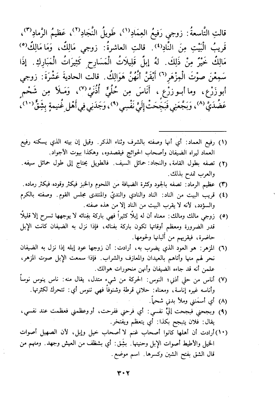 قَالَتِ التَّاسِعَةُ: زَوْجِي رَفِيعُ الْعِمَادِ (1) ، طَوِيلُ النَّجَادِ (2) عَظِيمُ الرَّمَادِ (3) ، قَرِيبُ الْبَيْتِ مِنَ النَّادِ (4) . قَالَتِ الْعَاشِرَةُ: زَوْجِي مَالِكٌ، ومَا مَالِكٌ (5) مَالِكٌ خَيْرٌ مِنْ ذَلِكَ. لَهُ إِبِلٌ قَلِيلاتُ الْمَسَارِحِ كَثِيرَاتُ الْمَبَارِكِ. إِذَا سَمِعْنَ صَوْتَ الْمِزْهَرِ (6) أَيْقَنَّ أَنَّهُنَّ هوالك. قالت الحاديثة عَشْرَةَ: زَوْجِي أَبُو زَرْعٍ، ومَا أَبُو زَرْعٍ، أَنَاسَ مِنْ حُلُيٍّ أُذُنِي (7) ، ومَلأَ مِنْ شَحْمٍ عَضُدَيَّ (8) ، ويجعني فَبَجَحَتْ إِلَيَّ نَفْسِي (9) ، وجَدَنِي فِي أهل غنيمة بشق (10) ،