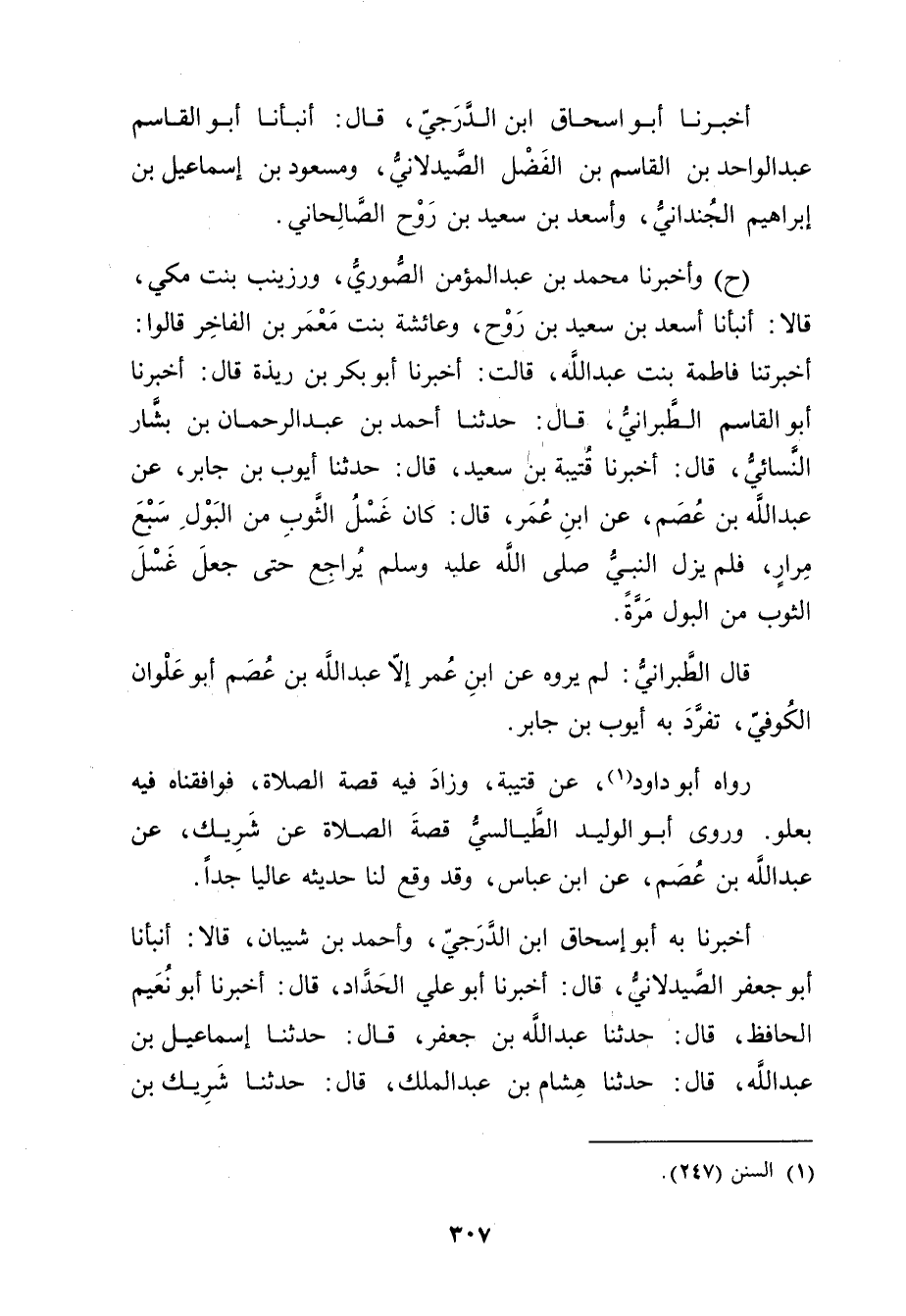 (ح) ، وأَخْبَرَنَا مُحَمَّدُ بن عبد المؤمن الصوري، ورزينب بِنْتُ مَكِّيٍّ، قَالا: أَنَبَأَنَا أَسْعَدُ بْنُ سَعِيد بْنِ رَوْحٍ، وعَائِشَةُ بِنْتُ مَعْمَرِ بْنِ الْفَاخِرِ قَالُوا: أَخْبَرَتْنا فَاطِمَةُ بِنْتُ عَبد اللَّهِ، قَالَتْ: أخبرنا أَبُو بَكْرِ بْنُ رِيذَةَ قال: أخبرنا أَبُو الْقَاسِمِ الطَّبَرَانِيُّ، قال: حَدَّثَنَا أَحْمَدُ بْنُ عَبْدِ الرَّحْمَنِ بْنِ بَشَّارٍ النَّسَائي، قال: أَخْبَرَنَا قُتَيْبَةُ بْنُ سَعِيد، قال: حَدَّثَنَا أَيُّوبُ بْنُ جَابِرٍ، عَنْ عَبد اللَّهِ بْنِ عصم، عَنِ ابْنِ عُمَر، قال: كَانَ غَسْلُ الثَّوْبِ مِنَ الْبَوْلِ سَبْعَ مِرَارٍ، فَلَمْ يَزَلِ النَّبِيُّ صَلَّى اللَّهُ عَلَيْهِ وسَلَّمَ يُرَاجِعُ حَتَّى جَعَلَ غَسْلَ الثَّوْبِ مِنَ الْبَوْلِ مَرَّةً.
