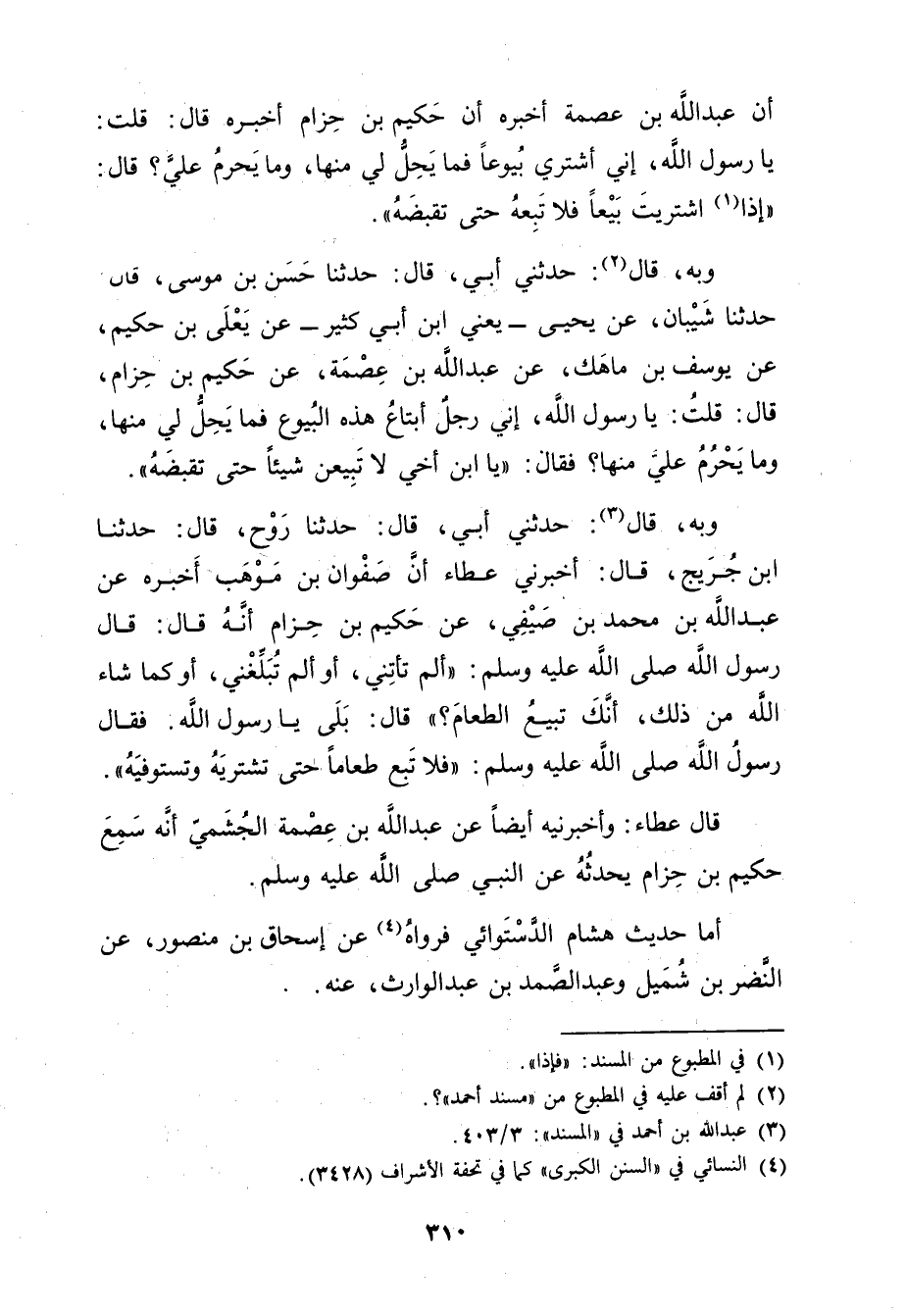 وبِهِ، قال (2) : حَدَّثني أبي، قال: حَدَّثَنَا حَسَنُ بْنُ مُوسَى، قال حَدَّثَنَا شَيْبَانُ، عَنْ يَحْيَى، يَعْنِي ابْنَ أَبي كَثِيرٍ، عَن يَعْلَى بْنِ حَكِيمٍ، عَنْ يُوسُفَ بْنِ مَاهَكَ، عن عَبد الله بن عصمة، عَنْ حَكِيمِ بْنِ حِزَامٍ، قال: قُلْتُ: يَا رَسُولَ اللَّهِ، إِنِّي رَجُلٌ أَبْتَاعُ هَذِهِ الْبُيُوعَ فَمَا يَحِلُّ لِي مِنْهَا، ومَا يَحْرُمُ عَلَيَّ مِنْهَا؟ فَقَالَ: يَا ابْنَ أَخِي لا تَبِيعَنَّ شَيْئًا حَتَّى تَقْبِضَهُ.