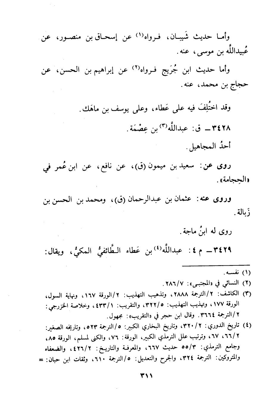 (3) الكاشف: 2 / الترجمة 2888، وتذهيب التهذيب: 2 / الورقة 167، ونهاية السول، الورقة 177، وتهذيب التهذيب: 5 / 322، والتقريب: 1 / 433، وخلاصة الخزرجي: 2 / الترجمة 3664. وَقَال ابن حجر في "التقريب": مجهول.