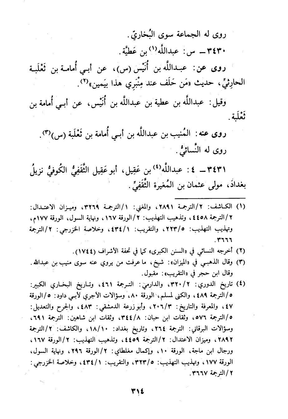 (1) الكاشف: 2 / الترجمة 2891، والمغني: 1 / الترجمة 3269، وميزان الاعتدال: 2 / الترجمة 4458، وتذهيب التهذيب: 2 / الورقة 167، ونهاية السول، الورقة 177 م، وتهذيب التهذيب: 5 / 223، والتقريب: 1 / 434، وخلاصة الخزرجي: 2 / الترجمة 3666.