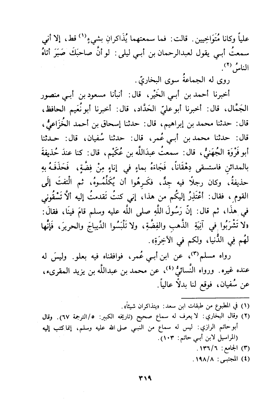 أخبرنا أَحْمَدُ بْن أَبي الخير، قال: أَنْبَأَنَا مسعود بْن أَبي منصور الجمال، قال: أَخْبَرَنَا أَبُو عَلِيّ الحداد، قال: أَخْبَرَنَا أَبُو نُعَيْمٍ الْحَافِظُ، قال: حَدَّثَنَا مُحَمَّدُ بْنُ إِبْرَاهِيمَ، قال: حَدَّثَنَا إِسْحَاقُ بْنُ أَحْمَدَ الْخُزَاعِيُّ، قال: حَدَّثَنَا مُحَمَّدُ بْنُ أَبي عُمَر، قال: حَدَّثَنَا سُفْيَانُ، قال: حَدَّثَنَا أَبُو فَرْوَةَ الْجُهَنِيُّ، قال: سَمِعْتُ عَبد اللَّهِ بْنَ عُكَيْمٍ، قال: كُنَّا عِنْدَ حُذَيْفَةَ بِالْمَدَائِنِ فَاسْتَسْقَى دِهْقَانًا، فَجَاءَهُ بِمَاءٍ في إناء من فضة، فحذفه بِهِ حُذَيْفَةُ، وكَانَ رَجُلا فِيهِ جِدٌّ، فَكَرِهُوا أَنْ يُكَلِّمُوهُ، ثُمَّ الْتَفَتَ إِلَى الْقَوْمِ، فَقَالَ: أَعْتَذِرُ إِلَيْكُمْ مِنْ هَذَا، إِنِّي كُنْتُ تَقَدَّمْتُ إِلَيْهِ أَلا تَسْقُونِي فِي هَذَا، ثُمَّ قال: إِنَّ رَسُولَ اللَّهِ صلى الله عليه وسلم قَامَ فِينَا، فَقَالَ: لا تَشْرَبُوا فِي آنِيَةِ الذَّهَبِ والْفِضَّةِ، ولا تَلْبَسُوا الدِّيبَاجَ والْحَرِيرَ، فَإِنَّهَا لَهُمْ فِي الدُّنْيَا، ولَكُمْ فِي الآخِرَةِ.
