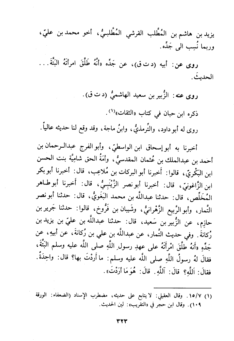 أَخْبَرَنَا بِهِ أَبُو إِسْحَاقَ ابْنُ الواسطي، وأبو الفرج عَبْد الرحمن بْنُ أَحْمَدَ بْنِ عَبد المَلِك بن عثمان المقدسي، وأمة الحق شَامِيَّةُ بِنْتُ الْحَسَنِ بْنِ الْبَكْرِيِّ، قالوا: أخبرنا أبزوالبركات بْنِ مُلاعِبٍ، قال: أَخْبَرَنَا أَبُو بَكْر بْن الزاغوني، قال: أَخْبَرَنَا أَبُو نَصْرٍ الزَّيْنَبِيُّ، قال: أخبرنا أبو طاهر المخلص، قال: حَدَّثَنَا عَبد الله بْن مُحَمَّد البغوي، قال: حَدَّثَنَا أَبُو نَصْرٍ التَّمَّارُ، وأَبُو الرَّبِيعِ الزَّهْرَانِيُّ، وشَيْبَانُ بْنُ فَرُّوخَ، قَالُوا: حَدَّثَنَا جَرِيرُ بْنُ حَازِمٍ، عَنِ الزُّبَيْرِ بْنِ سَعِيد، قال: حَدَّثَنَا عَبد اللَّهِ بْن علي بْن يزيد بْن ركانة. وفِي حَدِيثِ التَّمَّارِ، عَنْ عَبد الله بْن علي بْن ركانة، عَن أبيه، عن جده"أنه طَلَّقَ امْرَأَتَهُ عَلَى عَهْدِ رَسُولِ اللَّهِ صلى الله عليه وسلم الْبَتَّةَ، فَقَالَ لَهُ رَسُولُ اللَّهِ صلى الله عليه وسلم: ما أَرَدْتَ بِهَا؟ قال: واحِدَةً. فَقَالَ: اللَّهِ؟ قال: آللَّهِ. قال: هُوَ ما أردت.