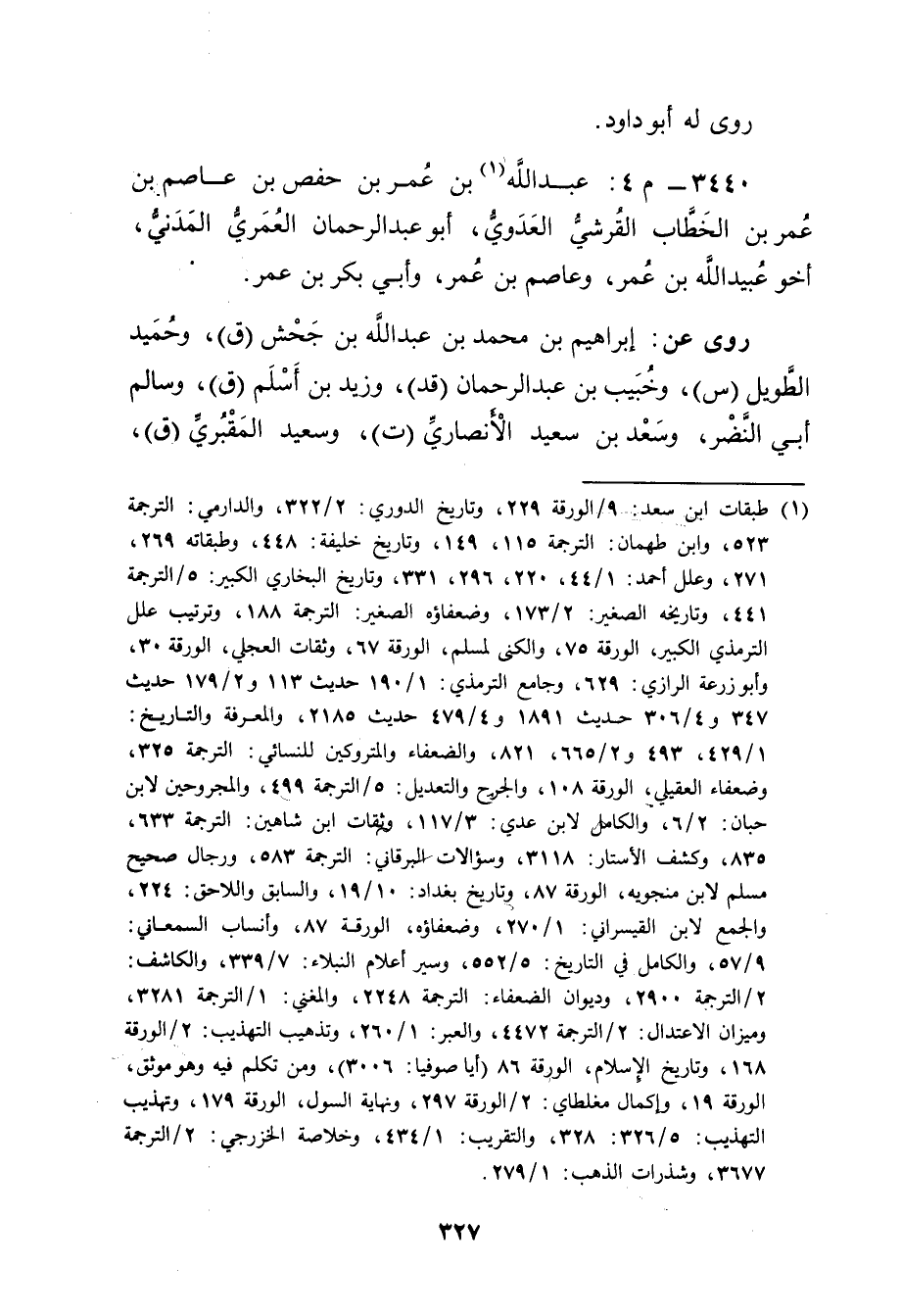 3440 - م 4: عَبد اللَّهِ بن عُمَر بْن حَفْص بْن عاصم بْن عُمَر بن الخطاب القرشي العدوي (1) ، أَبُو عَبْدِ الرَّحْمَنِ العُمَري المدني، أخو عُبَيد اللَّه بْن عُمَر، وعاصم بن عُمَر، وأبي بكر بن عُمَر.