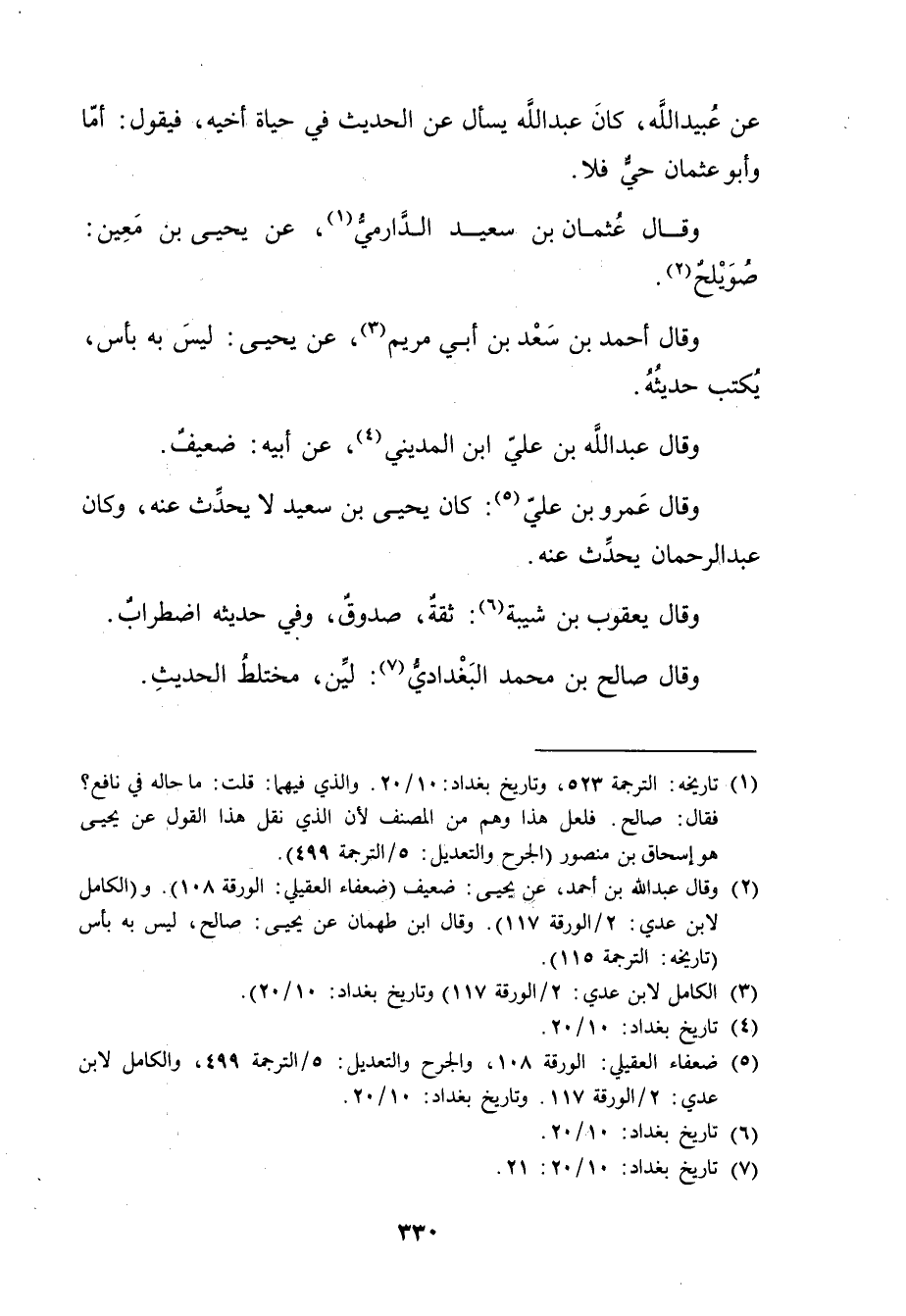 (5) ضعفاء العقيلي: الورقة 108، والجرح والتعديل: 5 / الترجمة 499، والكامل لابن عدي: 2 / الورقة 117. وتاريخ بغداد: 10 / 20.