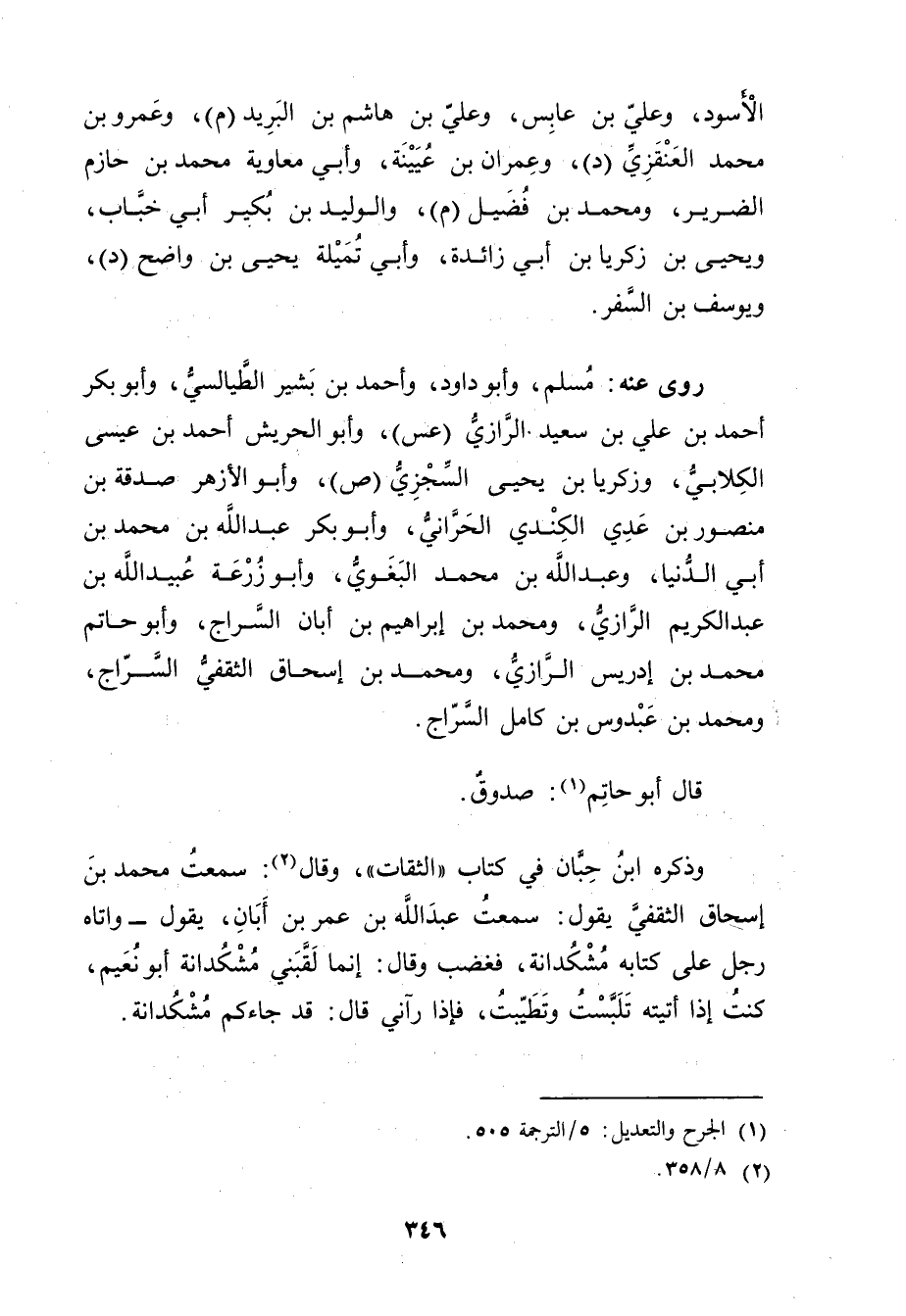 وذكره ابنُ حِبَّان في كتاب "الثقات"، وَقَال (2) : سمعت محمد بن إِسْحَاقَ الثقفي يَقُولُ: سمعت عَبد الله بْن عُمَر بْن أبان، يَقُولُ - واتاه رجل على كتابه مشكدانة، فغضب وَقَال: إنما لقبني مشكدانة أَبُو نعيم، كنت إِذَا اتيته تلبست وتطيبت، فَإِذَا رآني قال: قد جاءكم مشكدانة.