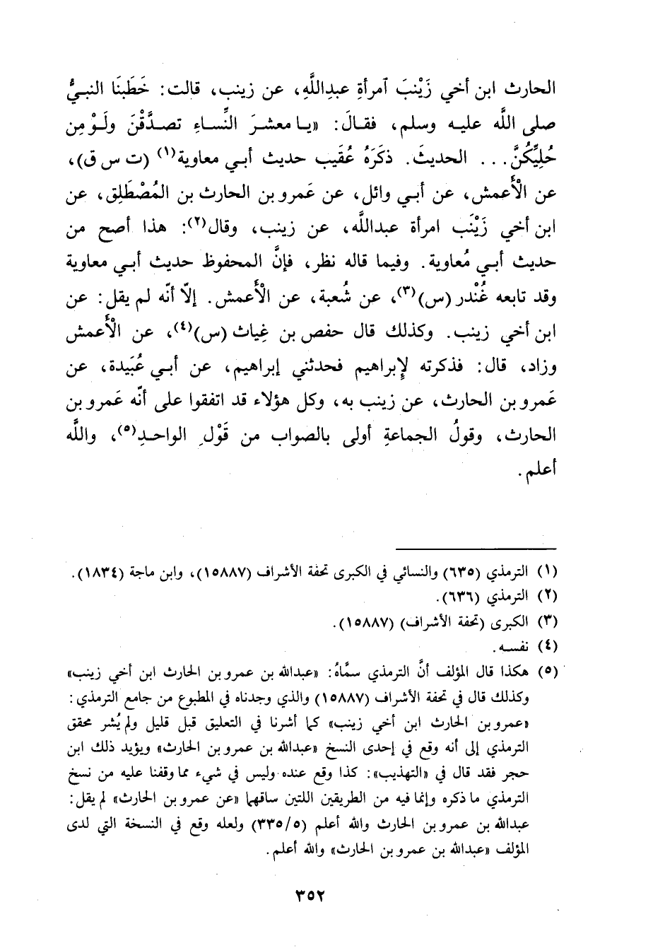 (5) هكذا قال المؤلف أن التِّرْمِذِيّ سماه: عَبد اللَّهِ بْن عَمْرو بْن الحارث ابن أخي زينب"وكذلا قال في تحفة الاشراف (15887) والذي وجدناه في المطبوع من جامع التِّرْمِذِيّ: عَمْرو بْنِ الْحَارِثِ ابن أخي زينب"كما أشرنا في التعليق قبل قليل ولم يشر محقق التِّرْمِذِيّ إلى أنه وقع في إحدى النسخ"عَبد اللَّهِ بْن عَمْرو بْن الحارث"ويؤيد ذلك ابن حجر فقد قال في "التهذيب": كذا وقع عنده وليس في شيء مما وقفنا عليه من نسخ التِّرْمِذِيّ ما ذكره وإنما فيه من الطريقين اللتين ساقهما"عن عَمْرو بن الحارث"لم يقل: عَبد اللَّهِ بْن عَمْرو بْن الحارث واللَّهُ أعلم (5 / 335) ولعله وقع في النسخة التي لدى المؤلف"عَبد الله بن عَمْرو بن الحارث"والله أعلم.