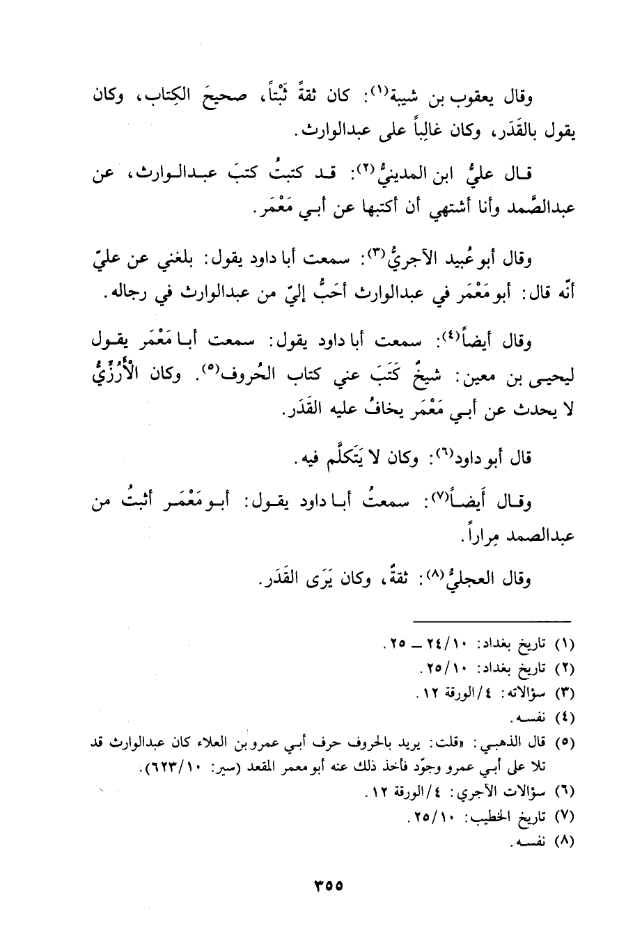 وَقَال أَيْضًا (7) : سمعت أبا داود يَقُولُ: أَبُو معمر أثبت من عبد الصمد مرارا. وَقَال العجلي (8) : ثقة، وكان يرى القدر.