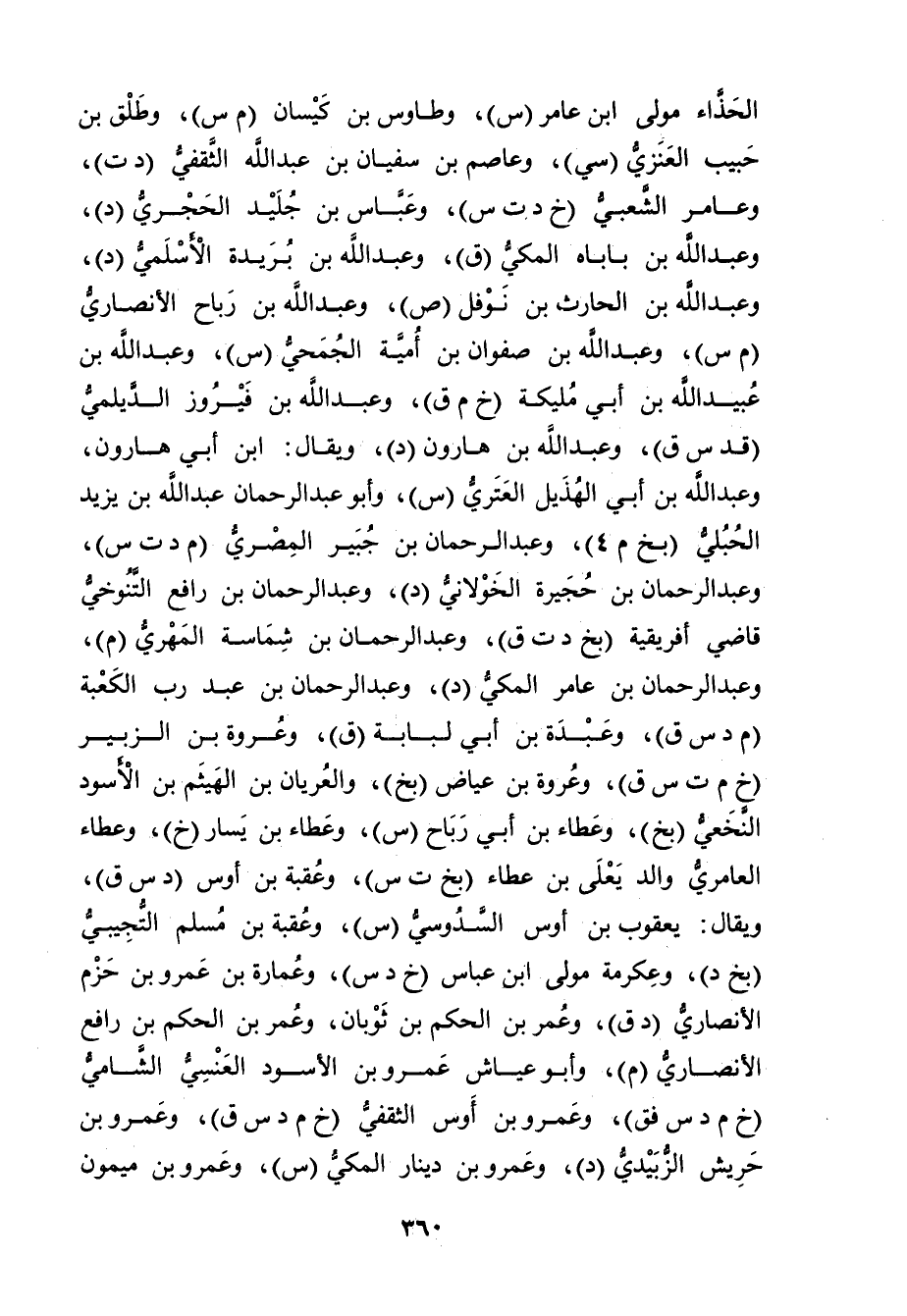 الحذاء مولى ابن عامر (س) ، وطاوس بْن كيسان (م س) ، وطلق بن حبيب العنزي (سي) ، وعاصم بْن سفيان بْن عَبد اللَّهِ الثقفي (د ت) ، وعامر الشعبي (خ د ت س) ، وعباس بن جليد الحجري (د) ، وعَبْد اللَّهِ بن باباه المكي (ق) ، وعبد الله بْن بريدة الأَسلميّ (د) ، وعَبْدُ اللَّهِ بْنُ الْحَارِثِ بن نوفل (ص) ، وعَبْد الله بْن رباح الأَنْصارِيّ (م س) ، وعَبْد اللَّهِ بن صفوان بن أمية الجمحي (س) ، وعَبْد الله بن عُبَيد الله بن أَبي مليكة (خ م ق) ، وعبد الله بْن فيروز الديلمي (قد ت س ق) ، وعبد الله بن هَارُونَ (د) ، ويُقال: ابن أَبي هارون، وعَبْد اللَّهِ بن أَبي الهذيل العتري (س) ، وأَبُو عَبْد الرَّحْمَنِ عَبد اللَّهِ بْن يزيد الحبلي (بخ م 4) ، وعبد الرحمن بْن جبير المِصْرِي (م د ت س) ، وعبد الرحمن بْن حجيرة الخولاني (د) ، وعبد الرحمن بن رافع التنوخي قاضي إفريقية (بخ د ت ق) ، وعبد الرحمن بن شِِمَاسَةَ المهري (م) ، وعبد الرحمن بن عامر المكي (د) ، وعبد الرحمن بْن عبد رب الكعبة (م د س ق) ، وعبدة بن أَبي لبابة (ق) ، وعروة بْن الزبير (خ م ت س ق) ، وعروة بْن عياض (بخ) ، والعريان بن الهيثم بن الأسود النخعي (بخ) ، وعطاء بْن أَبي رباح (س) ، وعطاء بن يسار (خ) ، وعطاء العامري والد يَعْلَى بن عطاء (بخ ت س) ، وعقبة بن أوس (د س ق) ، ويُقال: يعقوب بن أوس السدوسي (س) ، وعقبة بن مسلم التجيبي (بخ د) ، وعكرمة مولى ابْن عباس (خ د س) ، وعمارة بن عَمْرو بن حزم الأَنْصارِيّ (د ق) ، وعُمَر بن الحكم بن ثوبات، وعُمَر بْن الحكم بْن رافع الأَنْصارِيّ (م) ، وأَبُو عياش عَمْرو بن الأسود العنسي الشامي (خ م د س فق) ، وعَمْرو بن أوس الثقفي (خ م د س ق) ، وعَمْرو بْن حريش الزبيدي (د) ، وعَمْرو بن دينار المكي (س) ، وعَمْرو بن ميمون