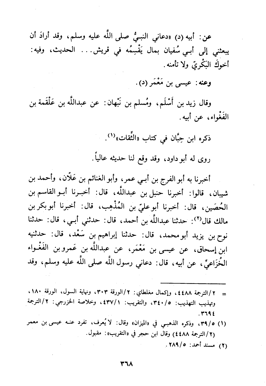 أَخْبَرَنَا بِهِ أَبُو الْفَرَجِ بْنُ أَبي عُمَر، وأَبُو الْغَنَائِمِ بْنُ عَلانَ، وأَحْمَدُ بْنُ شَيْبَانَ، قَالُوا: أَخْبَرَنَا حنبل بْن عَبد الله، قال: أَخْبَرَنَا أبو القاسم بْن الحصين، قال: أَخْبَرَنَا أبو علي بْن المذهب، قال: أَخْبَرَنَا أبو بكر بْن مالك قال (2) : حَدَّثَنَا عَبد اللَّهِ بْن أَحْمَدَ، قال: حَدَّثني أَبِي، قال: حَدَّثَنَا نُوحُ بْنُ يَزِيدَ أَبُو مُحَمَّدٍ، قال: حَدَّثَنَا إِبْرَاهِيمُ بْنُ سَعْدٍ، قال: حَدَّثَنِيهِ ابْنُ إِسْحَاقَ، عَنْ عِيسَى بْنِ مَعْمَرٍ، عَنْ عَبد اللَّهِ بن عَمْرو بن الفغواء الخزاعي، عَن أَبِيهِ، قال: دَعَانِي رَسُولُ اللَّهِ صلى الله عليه وسلم، وقد
