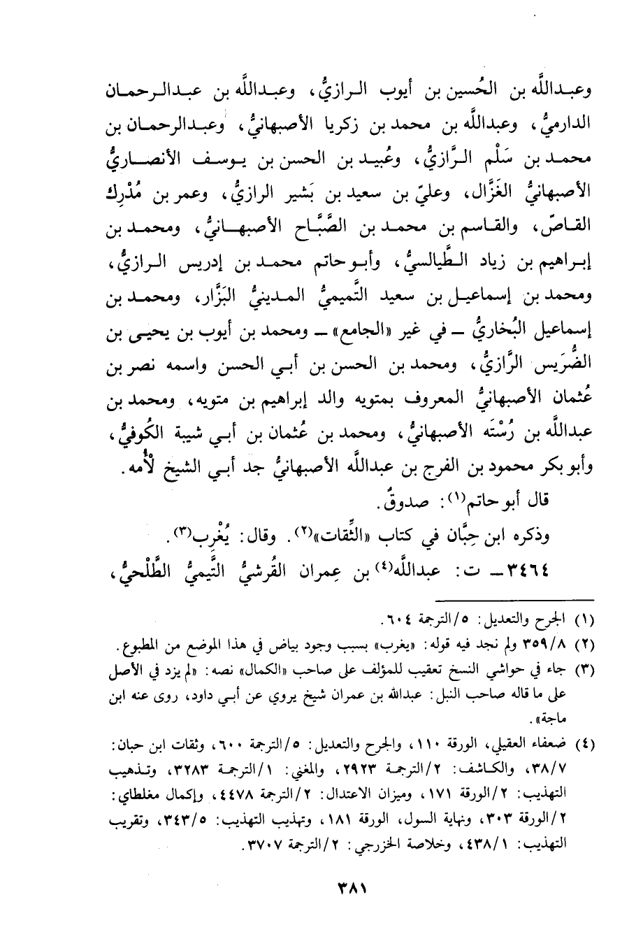 (4) ضعفاء العقيلي، الورقة 110، والجرح والتعديل: 5 / الترجمة 600، وثقات ابن حبان: 7 / 38، والكاشف: 2 / الترجمة 2923، والمغني: 1 / الترجمة 3283، وتذهيب التهذيب: 2 / الورقة 171، وميزان الاعتدال: 2 / الترجمة 4478، وإكمال مغلطاي: 2 / الورقة 303، ونهاية السول، الورقة 181، وتهذيب التهذيب: 5 / 343، وتقريب التهذيب: 1 / 438، وخلاصة الخزرجي: 2 / الترجمة 3707.