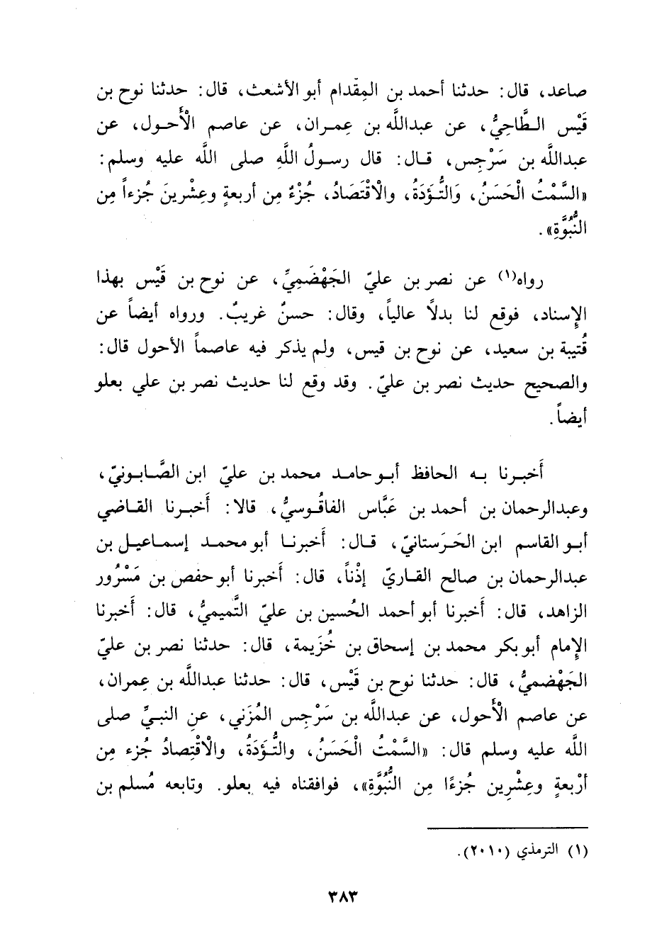 أخبرنا بِهِ الْحَافِظُ أَبُو حَامِدٍ مُحَمَّدُ بْنُ عَلِيِّ ابْنِ الصَّابُونِيِّ، وعبد الرحمن بْن أَحْمَد بْن عَبَّاسٍ الْفَاقُوسِيُّ، قَالا: أخبرنا الْقَاضِي أَبُو الْقَاسِمِ ابْنُ الْحَرَسْتَانِيِّ، قال: أَخْبَرَنَا أَبُو مُحَمَّدٍ إِسْمَاعِيلُ بْنُ عَبْدِ الرَّحْمَنِ بْنِ صَالِحٍ الْقَارِيُّ إِذْنًا، قال: أَخْبَرَنَا أَبُو حَفْصِ بْنُ مَسْرُورٍ الزَّاهِدُ، قال: أَخْبَرَنَا أَبُو أَحْمَدَ الْحُسَيْنُ بْنُ عَلِيٍّ التَّمِيمِيُّ، قال: أَخْبَرَنَا الإِمَامُ أَبُو بَكْر مُحَمَّد بْن إسحاق بْن خُزَيْمَةَ، قال: حَدَّثَنَا نَصْرُ بْنُ عَلِيٍّ الْجَهْضَمِيُّ، قال: حَدَّثَنَا نُوحُ بْنُ قَيْسٍ، قال: حَدَّثَنَا عَبد اللَّهِ بْنِ عِمْران، عَنْ عَاصِمٍ الأَحْوَلُ، عَنْ عَبد اللَّهِ بْنِ سَرْجِسَ الْمُزَنِيِّ، عَنِ النَّبِيِّ صَلَّى اللَّهُ عَلَيْهِ وسَلَّمَ قال: السَّمْتُ الْحَسَنُ، والتُّؤَدَةُ، والاقْتِصَادُ جُزْءٌ مِنْ أَرْبَعَةٍ وعِشْرِينَ جُزْءًا مِنَ النُّبُوَةِ"، فوَافَقْنَاهُ فِيهِ بِعُلُوٍّ. وتَابَعَهُ مُسْلِمُ بْن