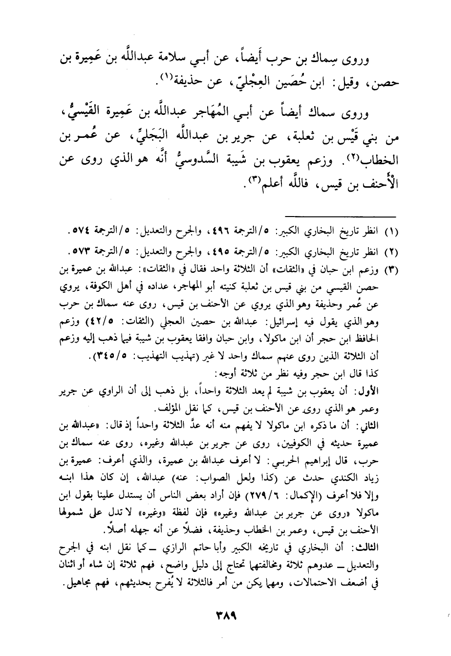 (3) وزعم ابن حبان في "الثقات" أن الثلاثة واحد فقال في "الثقات": عَبد اللَّهِ بْن عميرة بْن حصن القيسي من بْني قيس بْن ثعلبة كنيته أبو المهاجر، عداده في أهل الكوفة، يروي عن عُمَر وحذيفة وهو الذي يروي عن الأَحنف بن قيس، روى عنه سماك بن حرب وهو الذي يقول فيه إسرائيل: عَبد الله بن حصين العجلي (الثقات: 5 / 42) وزعم الحافظ ابن حجر أن ابن ماكولا، وابن حبان وافقا يعقوب بن شَيْبَة فيما ذهب إليه وزعم أن الثلاثة الذين روى عنهم سماك واحد لا غير (تهذيب التهذيب: 5 / 345) .