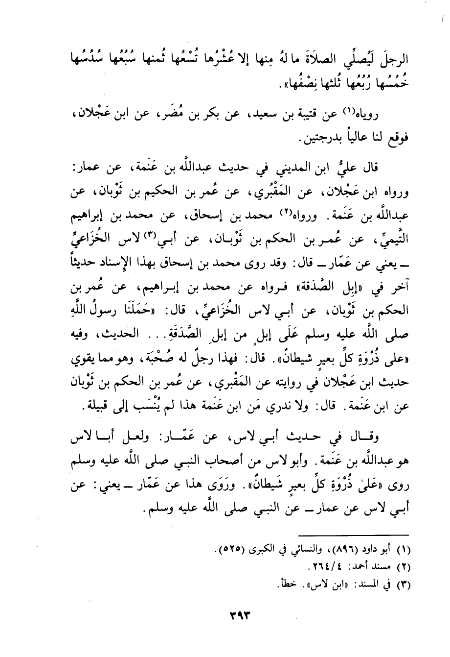 ورَوَاهُ (2) مُحَمَّدُ بْنُ إِسْحَاقَ، عَنْ مُحَمَّدِ بْنِ إِبْرَاهِيمَ التَّيْمِيّ، عَنْ عُمَر بْن الحكم بْن ثوبان، عَن أَبِي (3) لاسٍ الْخُزَاعِيِّ، يَعْنِي عَنْ عَمَّارٍ، قال: وقَدْ رَوَى مُحَمَّد بْن إِسْحَاقَ بهذا الإسناد حَدِيثًا آخَرَ فِي "إِبِلِ الصَّدَقَةِ"فَرَوَاهُ عَنْ مُحَمَّدِ بْنِ إِبْرَاهِيمَ، عَنْ عُمَر بْن الحكم بْن ثَوْبَانَ، عَن أَبِي لاسٍ الْخُزَاعِيِّ، قال: حَمَلَنَا رَسُولُ اللَّهِ صَلَّى اللَّهُ عَلَيْهِ وسَلَّمَ عَلَى إِبِلٍ مِنْ إِبِلِ الصَّدَقَةِ ... الْحَدِيثَ، وفِيهِ"عَلَى ذُرْوَةِ كُلِّ بَعِيرٍ شَيْطَانٌ.