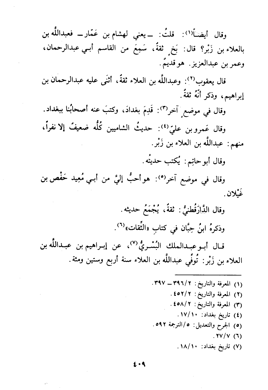 وَقَال عَمْرو بن علي (4) : حديث الشاميين كله ضعيف إلا نفرا، منهم: عَبد اللَّهِ بْن العلاء بْن زبر.