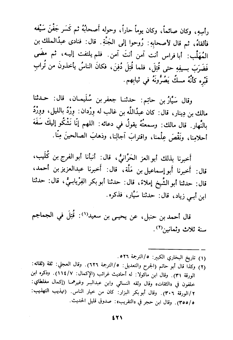 قال أحمد بْن حنبل، عَنْ يحيى بْن سَعِيد (1) : قتل فِي الجماجم سنة ثلاث وثمانين (2) .