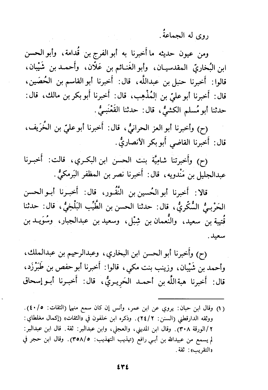 قَالا: أَخْبَرَنَا أَبُو الْحُسَيْنِ بْن النقور، قال: أَخْبَرَنَا أبو الْحَسَنِ الْحَرْبِيُّ السُّكَّرِيُّ، قال: حَدَّثَنَا الْحَسَنُ بْنُ الطَّيِّبِ الْبَلْخِيُّ، قال: حَدَّثَنَا قُتَيْبَةُ بْنُ سَعِيد، والنُّعْمَانُ بْنُ شِبْلٍ، وسَعِيد بْنُ عَبْدِ الْجَبَّارِ، وسُوَيْدُ بْنُ سَعِيد.