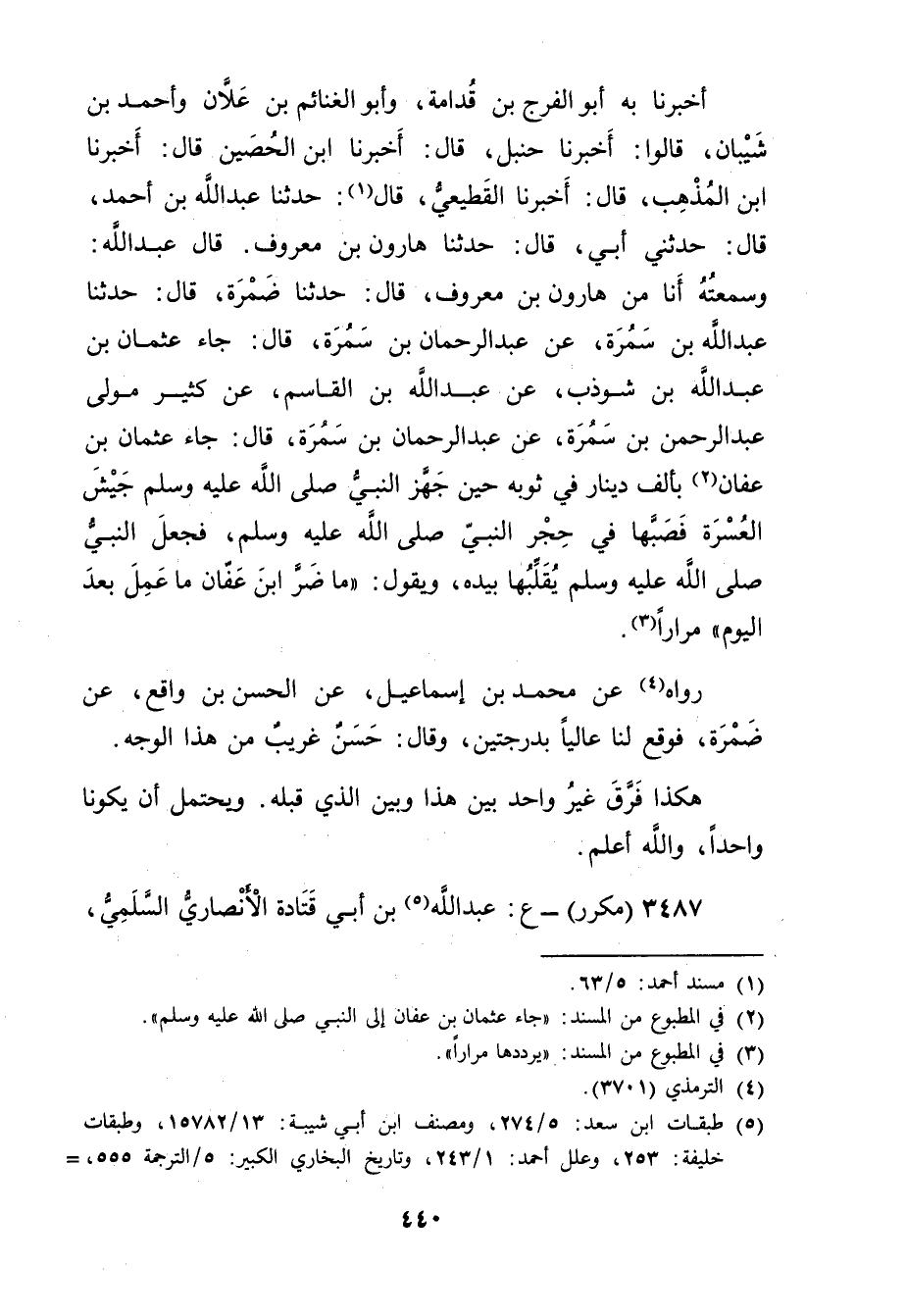 أَخْبَرَنَا بِهِ أَبُو الْفَرَجِ بْنُ قُدَامَةَ، وأَبُو الْغَنَائِمِ بْنُ عَلانَ وأَحْمَدُ بْنُ شَيْبَانَ، قَالُوا: أَخْبَرَنَا حنبل، قال: أخبرنا ابن الحصين قال: أخبرنا ابْنُ الْمُذْهِب، قال: أخبرنا القَطِيعِيّ، قال (1) : حَدَّثَنَا عَبد اللَّهِ بْن أَحْمَدَ، قال: حَدَّثني أَبِي، قال: حَدَّثَنَا هَارُونُ بْنُ مَعْرُوفٍ. قال عَبد اللَّهِ: وسَمِعْتُهُ أَنَا مِنْ هَارُونَ بْنِ مَعْرُوفٍ، قال: حَدَّثَنَا ضَمْرَةُ، قال: حَدَّثَنَا عَبد اللَّهِ بْنُ سَمُرَة، عَنْ عَبْدُ الرَّحْمَنِ بْنُ سَمُرَة، قال: جَاءَ عُثْمَانُ بْنُ عَبد اللَّهِ بْنِ شَوْذَبٍ، عَنْ عَبد اللَّهِ بْنِ الْقَاسِمِ، عَنْ كَثِيرٍ مَوْلَى عَبْد الرحمن بْن سَمُرَة، عَنِ عَبْدُ الرَّحْمَنِ بْنُ سَمُرَة، قال: جَاءَ عُثْمَانُ بْنُ عَفَّانَ (2) بِأَلْفِ دِينَارٍ فِي ثَوْبِهِ حِينَ جَهَّزَ النَّبِيُّ صلى الله عليه وسلم جَيْشَ الْعُسْرَةِ فَصَبَّهَا فِي حِجْرِ النَّبِيُّ صلى الله عليه وسلم، فَجَعَلَ النَّبِيُّ صَلَّى اللَّهُ عَلَيْهِ وسَلَّمَ يُقَلِّبُهَا بِيَدِهِ، ويَقُولُ: مَا ضَرَّ ابْنَ عَفَّانَ مَا عَمِلَ بَعْدَ الْيَوْمِ"مِرَارًا (3) .