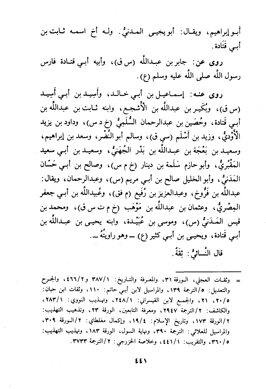 رَوَى عَن: جابر بْن عَبد الله (س ق) ، وأبيه أبي قتادة فارس رَسُول اللَّهِ صلى الله عليه وسَلَّمَ (ع) .