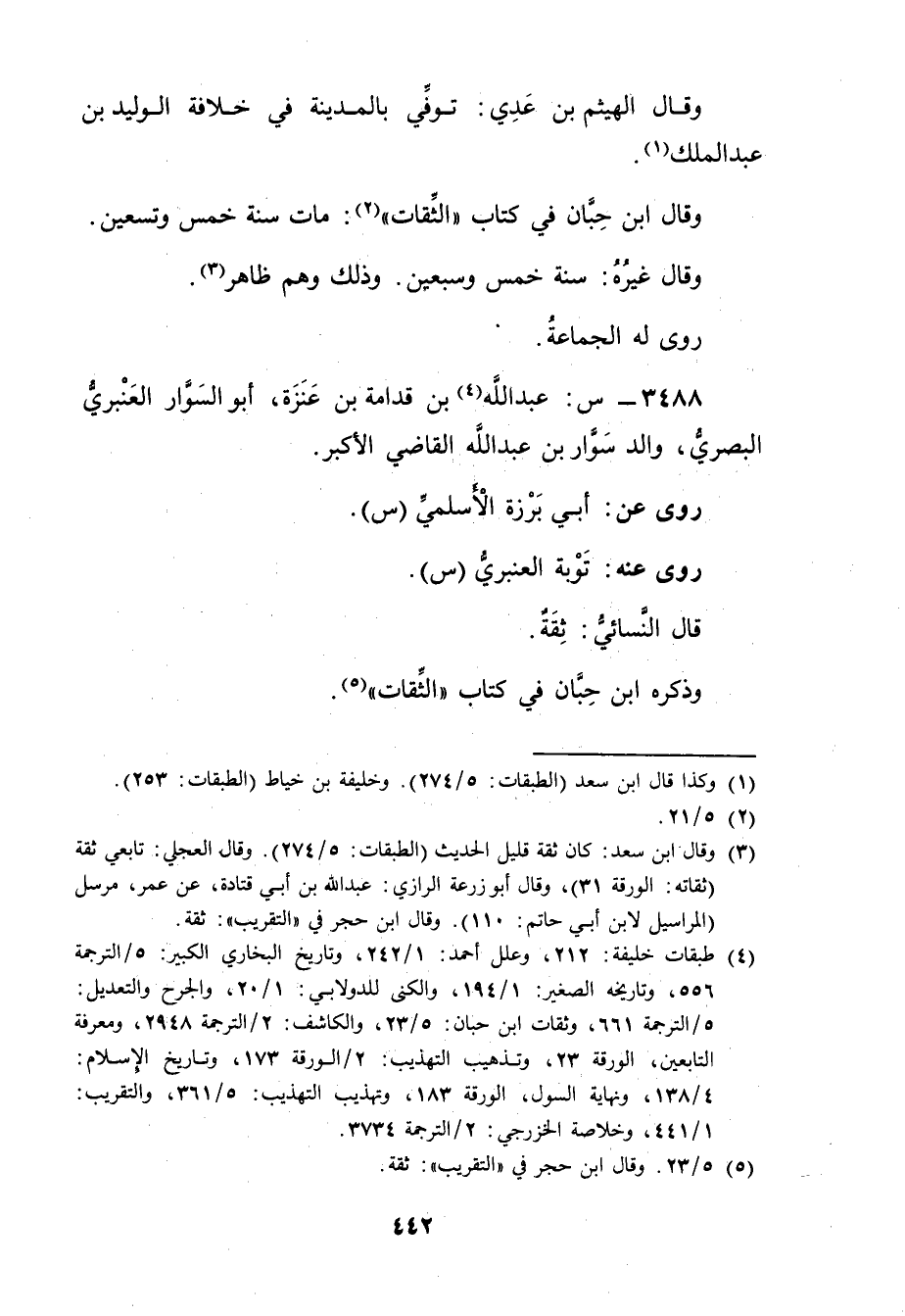 3488 - س: عَبد اللَّهِ بن قدامة بن عنزة (4) ، أَبُو السوار العنبري البَصْرِيّ، والد سوار بْن عَبد اللَّهِ القاضي الأكبر.