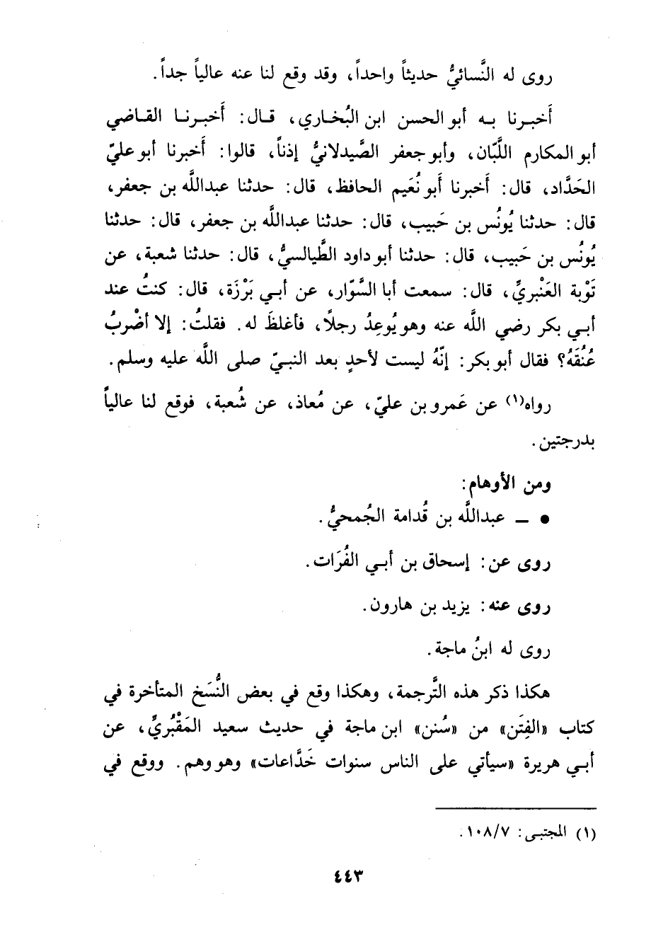 هكذا ذكره هَذِهِ الترجمة، وهكذا وقع فِي بعض النسخ المتأخرة فِي كتاب"الفتن"من"سنن"ابْن مَاجَهْ فِي حديث سَعِيد المقبري، عَن أَبِي هُرَيْرة"سيأتي على الناس سنوات خداعات"وهو وهم. ووقع فِي