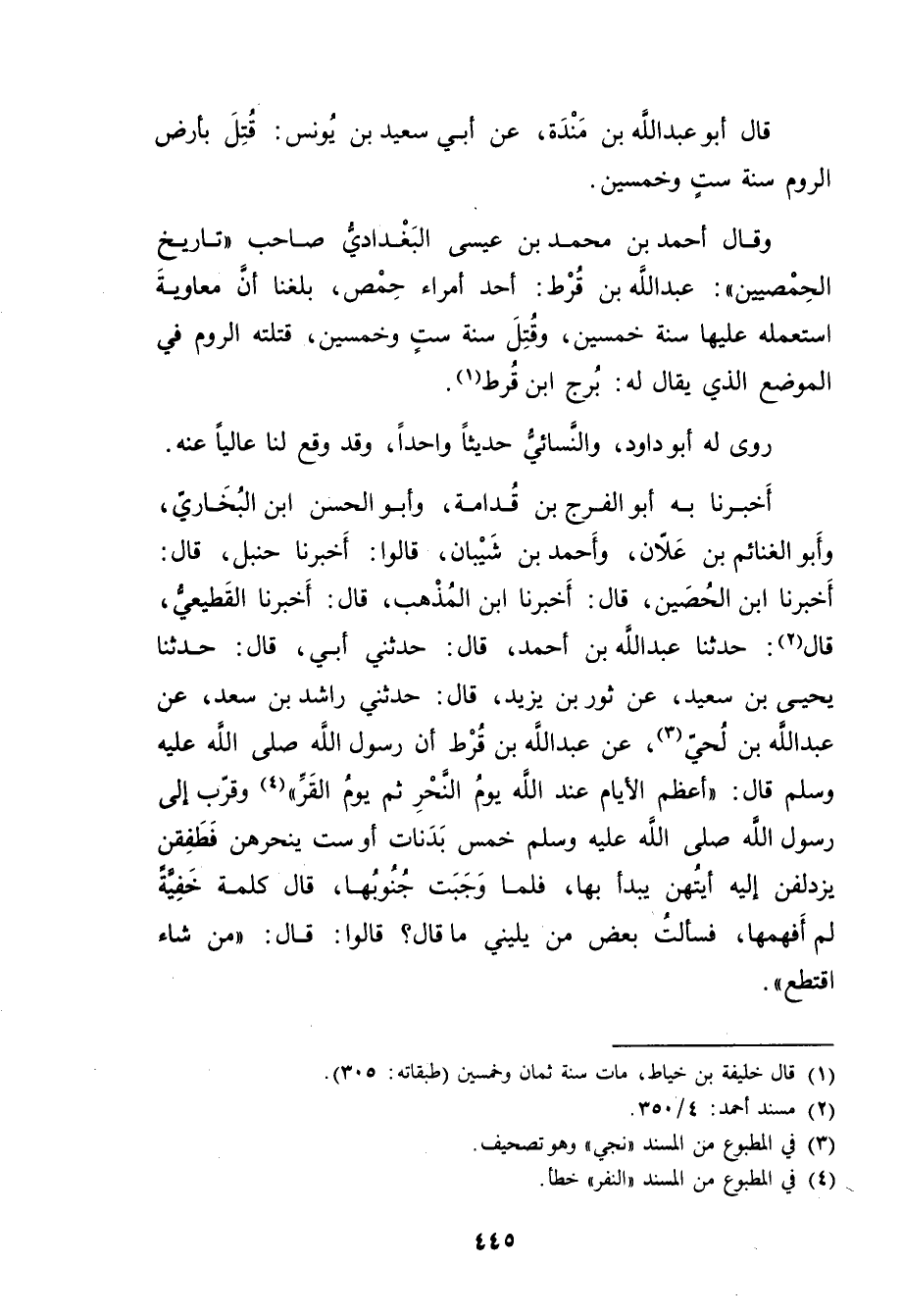 وَقَال أحمد بن مُحَمَّدِ بْن عِيسَى البغدادي صاحب"تاريخ الحمصيين": عَبد اللَّهِ بن قرط: أحد أمراء حمص، بلغنا أن معاوية استعمله عليها سنة خمسين، وقتل سنة ست وخمسين، قتلته الروم فِي الموضع الَّذِي يقال له: برج ابن قرط (1) .