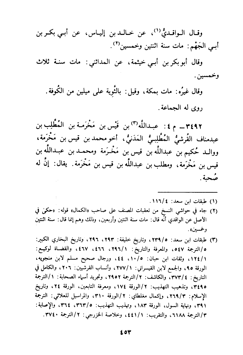 3492 - م 4: عَبد اللَّهِ بْن قيس بْن مخرمة بْن المطلب بن عبد مناف القرشي المطلبي المدني (3) ، أخو محمد بن قيس بن مخرمة، ووالد حُكَيْم بن عَبد اللَّهِ بن قيس بن مخرمة ومحمد بن عَبد اللَّه بْن قيس بْن مخرمة، ومطلب بن عَبد اللَّهِ بْنِ قيس بن مخرمة، يُقَال: أن له صحبة.